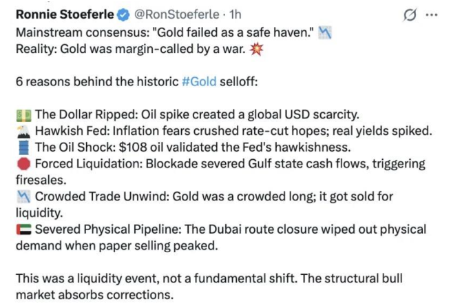 When the markets (equities, bonds, crypto and PMs) are in the toilet from a risk off due to Iran & potential stagflation, wouldn't read too much into the gold and silver decline. The fundamentals are there and $4,300 and $65 are still more then what I was expecting early last year. They'll be back.