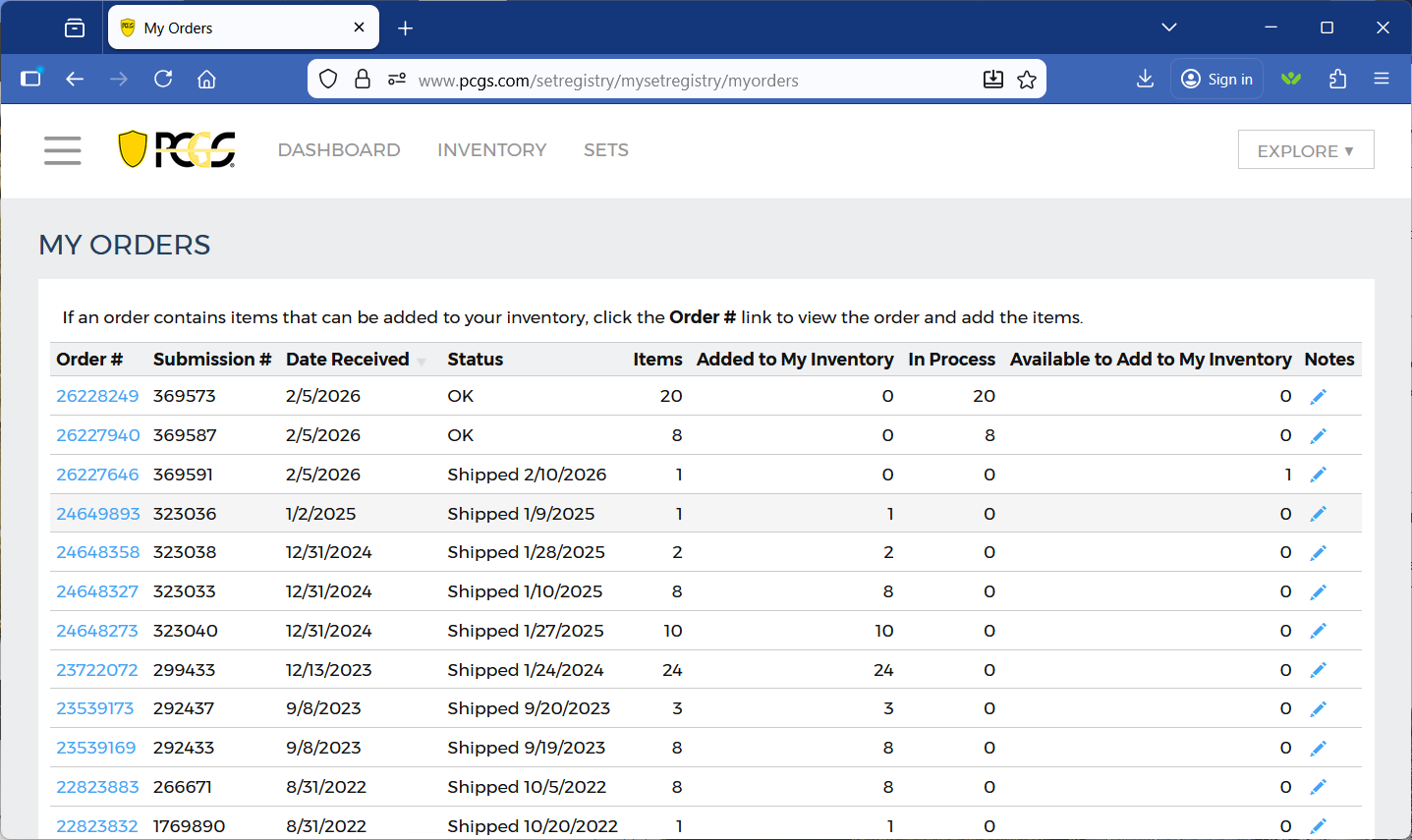 Under My Account, the new UI for (completed) orders in the My Orders list does not seem to have the add to inventory action. I thought it may have in the past. (SUG: A simple link to the PCGS order number would fix that.)