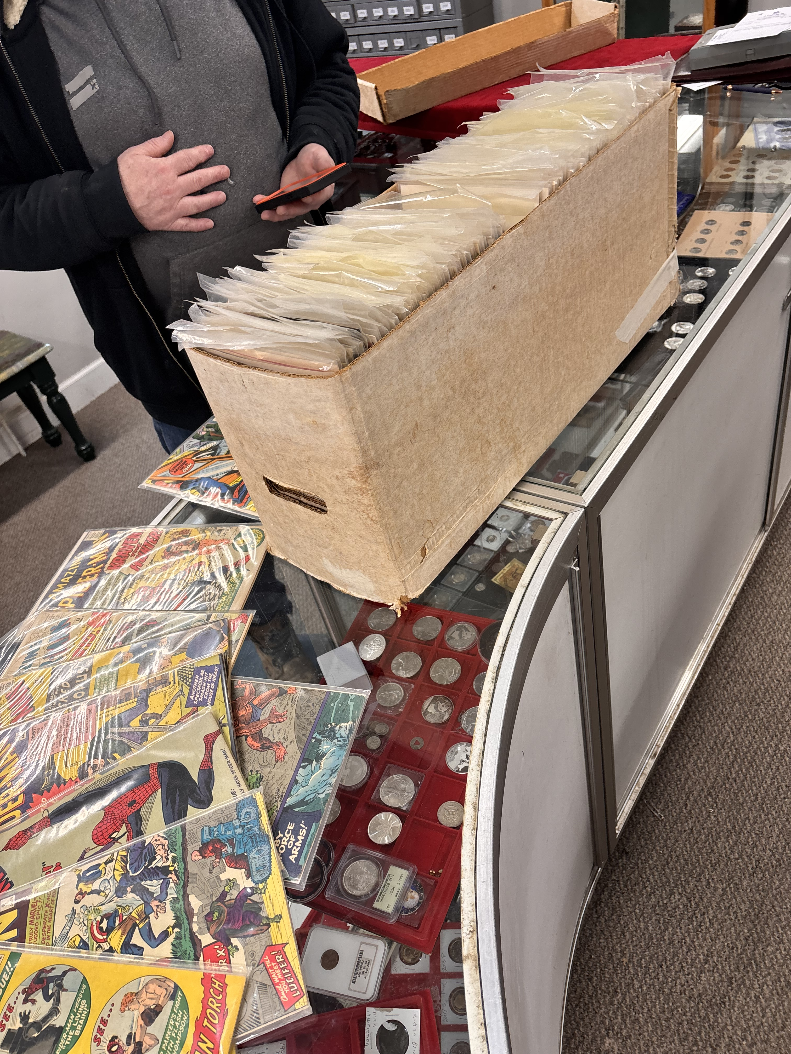 So these guys walk into the shop and start laying all this stuff out on my counter. And I say “this is a coin shop, not a comic shop.” Most of the customers are there for silver or gold. Hardly any numismatic activity, lately.