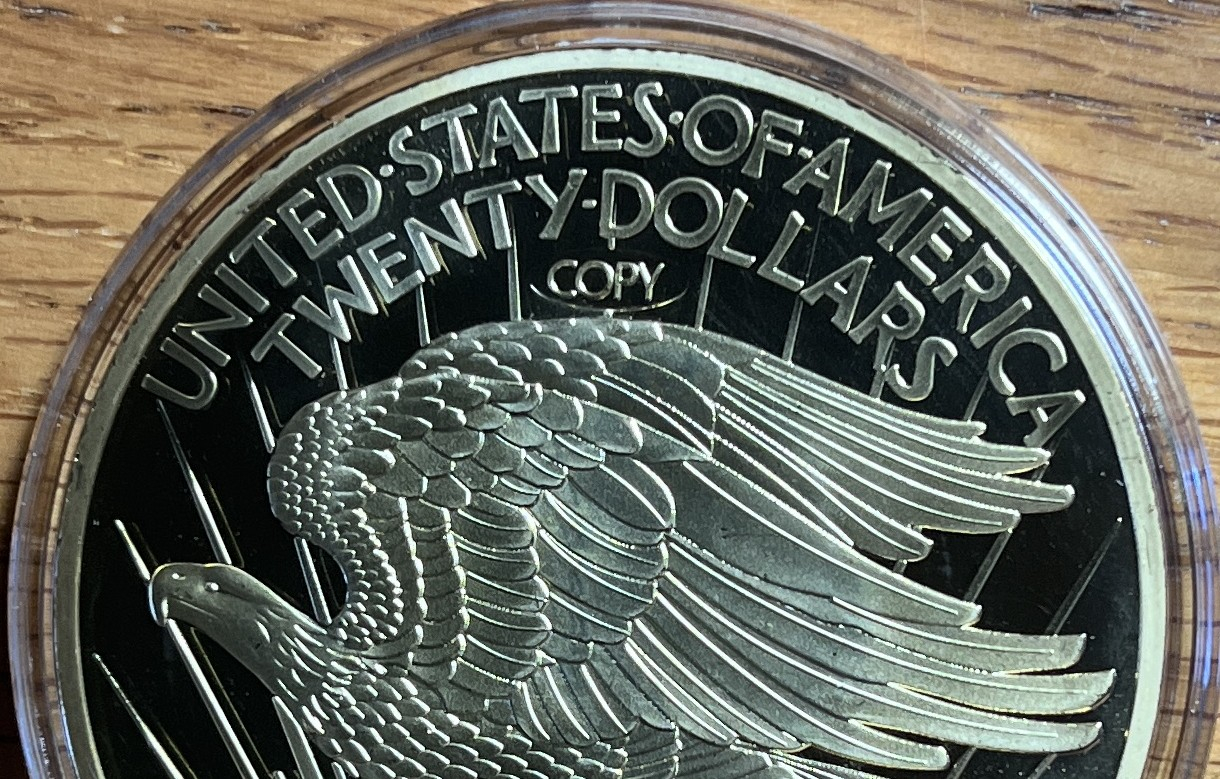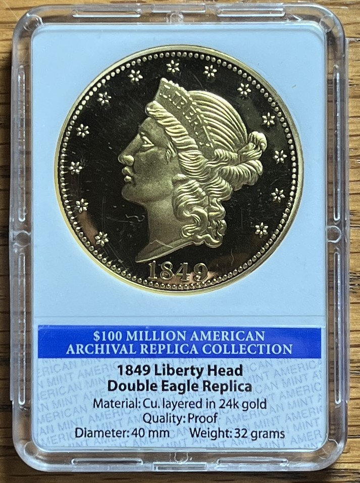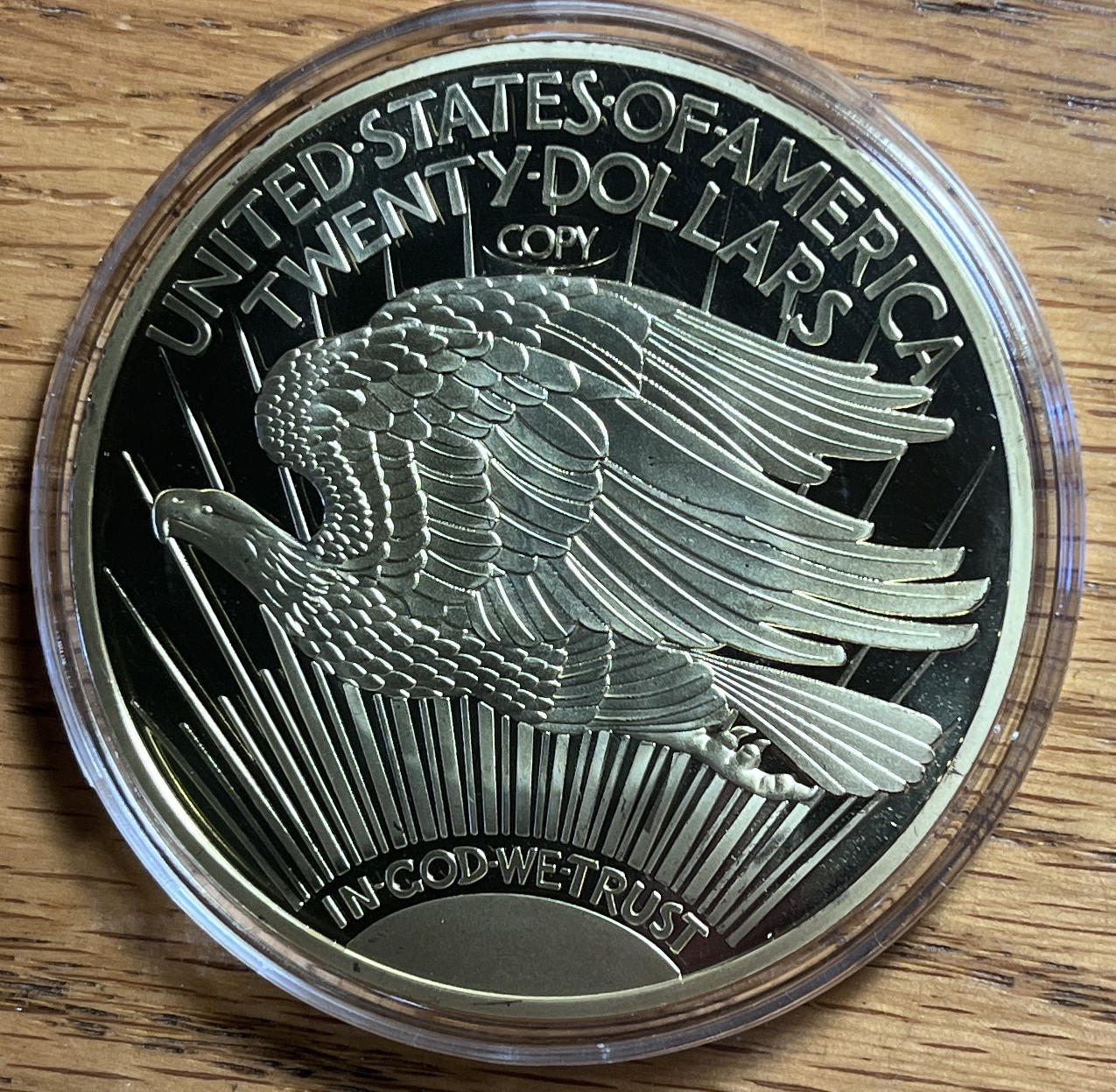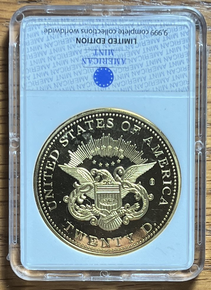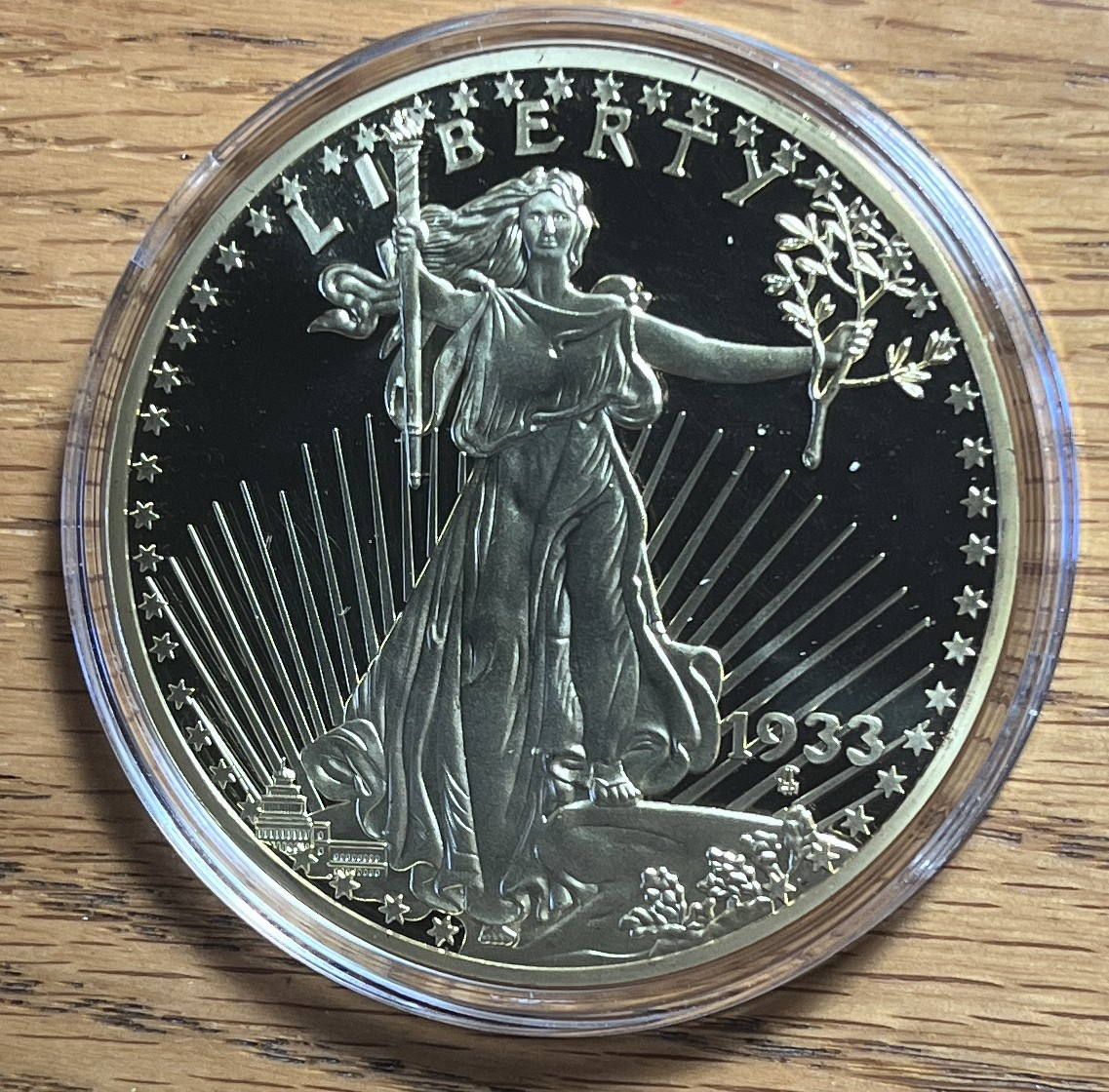 I discovered later than I made the post that I have FOUR, that's right, FOUR 1933 DE copies. One is the giant one (pictured) and then two identical American Mint slabbed copies (of 1933 DE) in the soap bar style holder. The fourth one is a slabbed American Mint 1933 DE copy (also in a soap bar style holder) that is distinctly different from the other two slabbed 1933 DE copies. Same high quality and identical in all respects except for how American Mint marked as a copy. I will post an image of the 4th one here if I get indication from just one reader who is not in current Ignore status that they would like to see image of it.