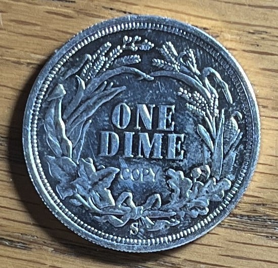 I actually have two of these. One the giant 1933 DE copy (pictured) contained in a capsule and one in a slab (similar to the ANACS "soap bar") by the same minter as the 1849 DE copy shown earlier. I might try to seek out an 1894-S dime copy in American Mint holder. Not sure that such a thing exists, however.