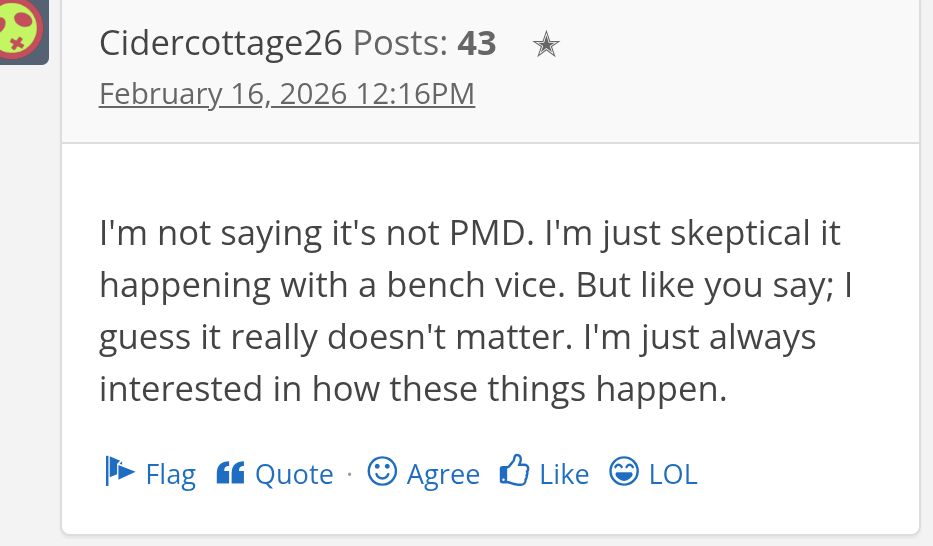 I'm not saying it's not PMD. I'm just skeptical it happening with a bench vice. But like you say; I guess it really doesn't matter. I'm just always interested in how these things happen.