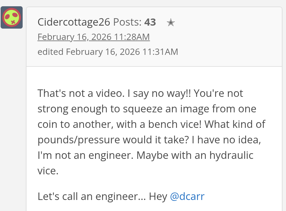That's not a video. I say no way!! You're not strong enough to squeeze an image from one coin to another, with a bench vice! What kind of pounds/pressure would it take? I have no idea, I'm not an engineer. Maybe with an hydraulic vice.