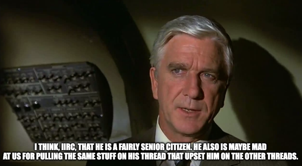 I think, IIRC, that he is a fairly senior citizen. He also is maybe mad at us for pulling the same stuff on his thread that upset him on the other threads.