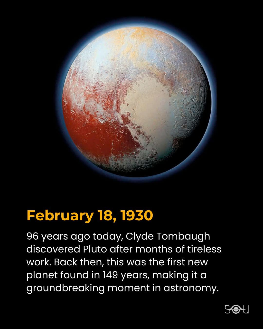 Pluto was discovered on February 18th, 1930 by Clyde Tombaugh at the Lowell Observatory in Arizona. It was the first major celestial object discovered by an American.