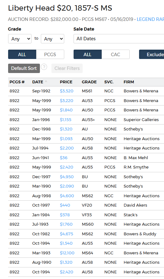 Lets say I wanna see graded coins minted in 1720-1740 in Austria, I go to Austria Pop page https://pcgs.com/pop/detail/austria/1664/976 and then I have over 26 pages (with 100 results each) to look through without any way of sorting