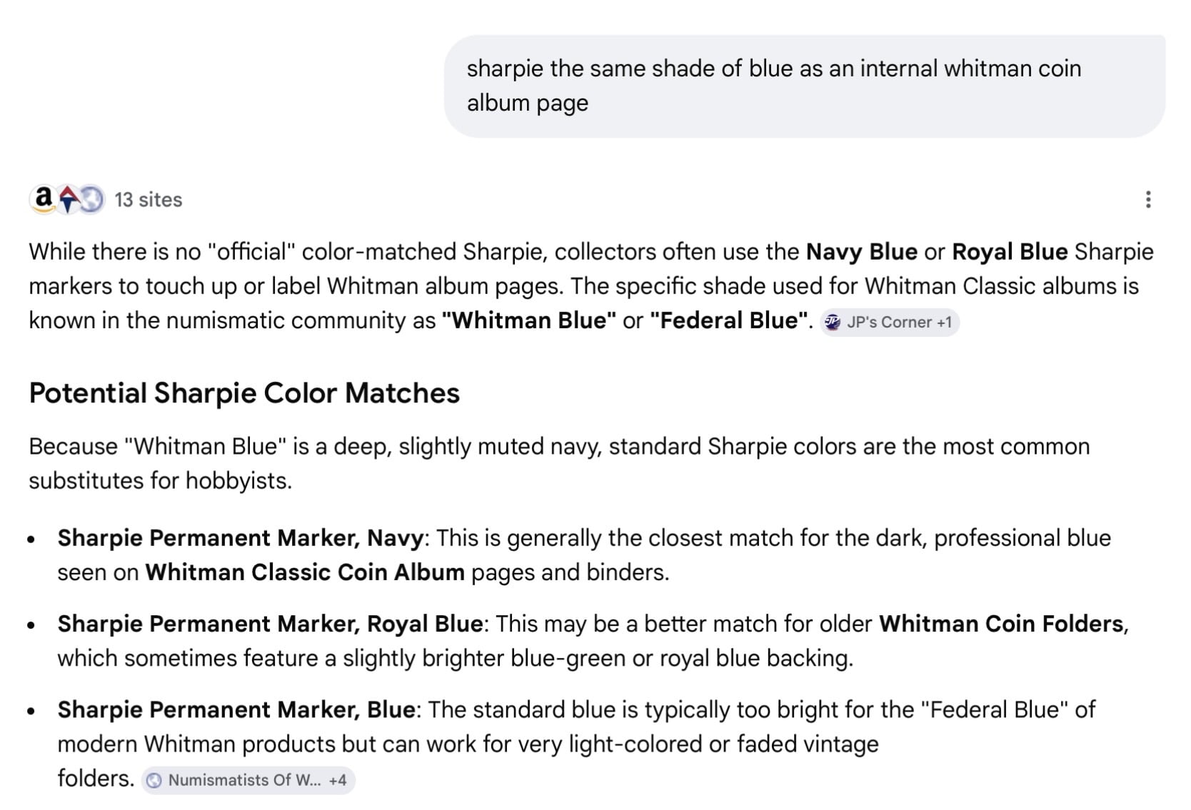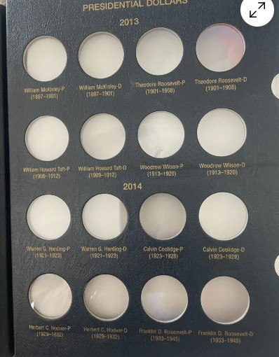 New pages are $10 per page and only have 9 holes per page. I needed a lot more than that. I found the Presidential Whitman album on eBay for $15. It has 5 pages with 16 spaces each (see above), a much better bargain. i have a sharpie same color as the pages, I'll cover the lettering and still flip them and use the backs.