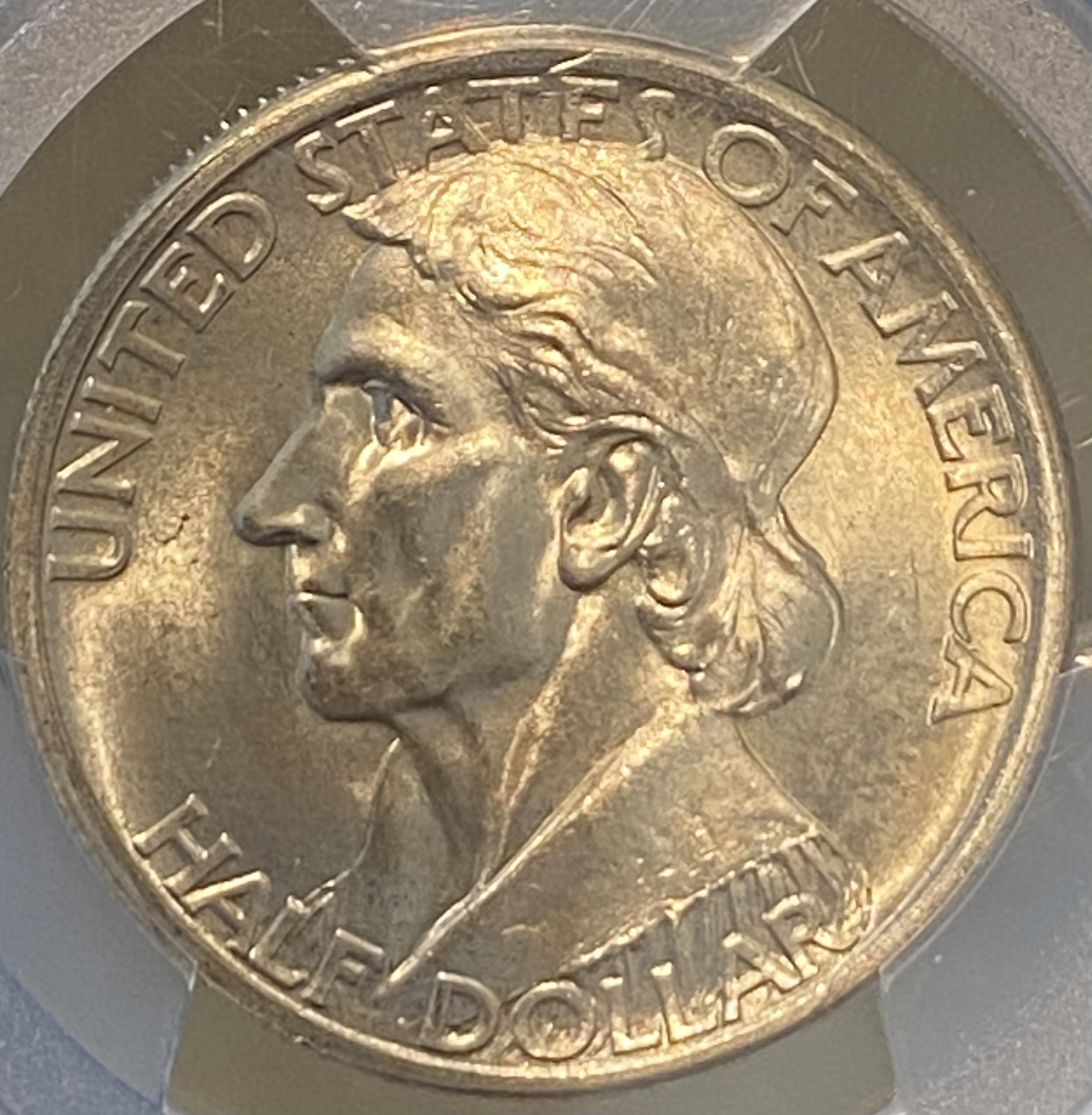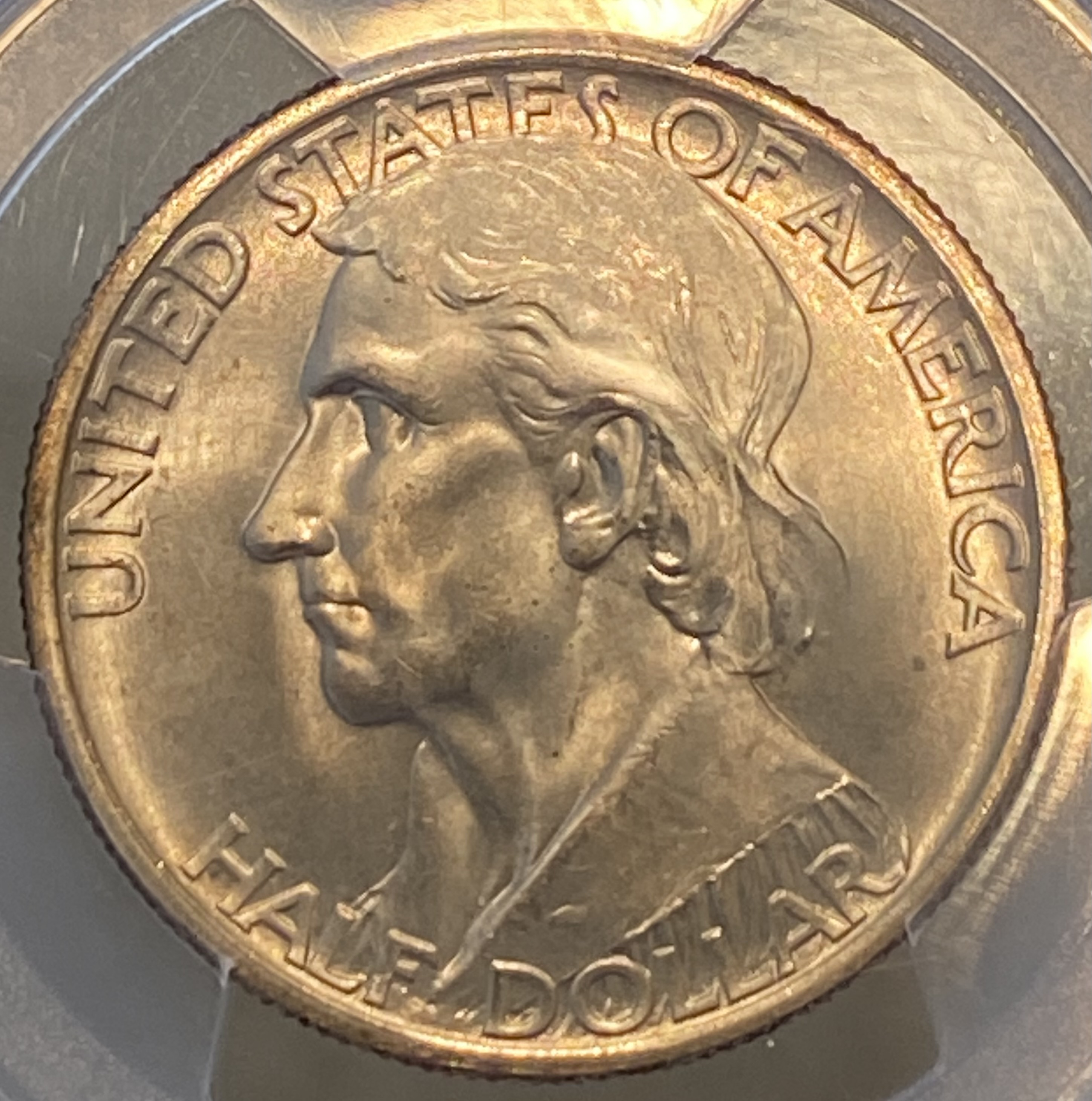 Some of the toning you don't like came from storage in the original holders in which the coins were issued. Here is a Delaware commemorative half dollar and an example of that type of holder. Collectors call it "tab toning." Sometimes it's nice; sometimes it isn't, especially if the coin has been left in the holder for too long. The coin and the holder did not come together.