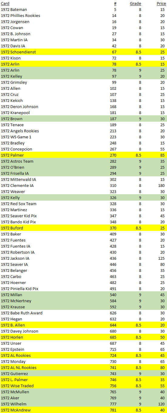 In my ongoing upgrade of my 1972 Topps set, it is time for my semi-annual sale of the cards that I have replaced. Prices are as shown, and are subject to negotiation if you buy $100 or more. Shipping is $5, which is waived if you spend $100 or more.