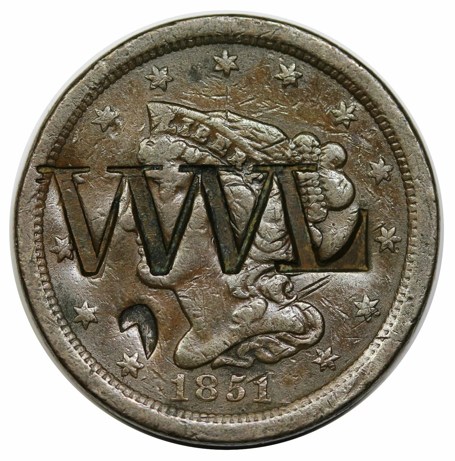 I think most collectors of Early Copper will view this as damaged. The collectors that gravitate towards counterstamped coins typically want one linked to either a movement (political or otherwise) or a specific merchant that would counterstamp coins as a marketing tool. Here are a couple of mine. Vote The Land Free was linked to the Free Soil Party and the election of 1848. I can't recall the vendor information for the WWL counterstamp, but it's in Rulau's book as Brunk L-26.