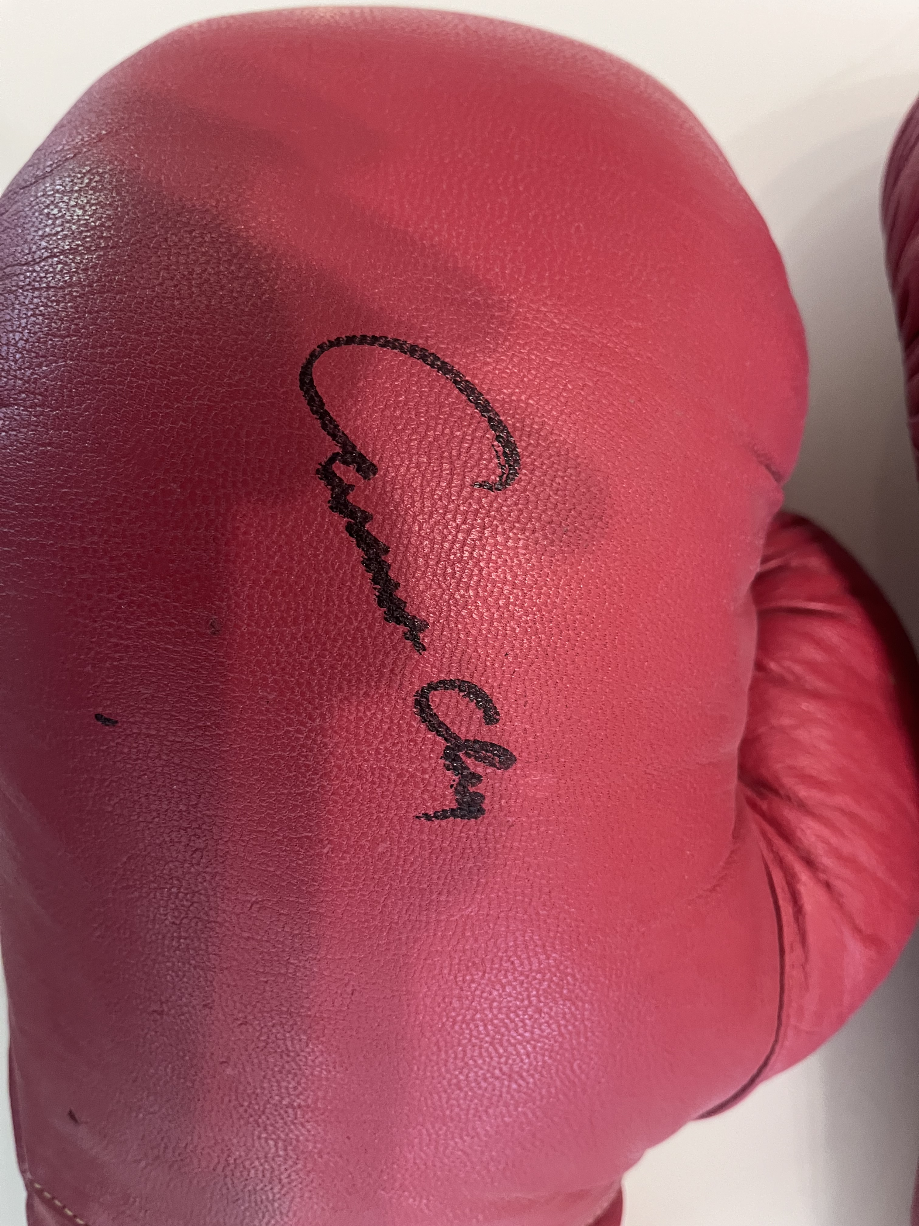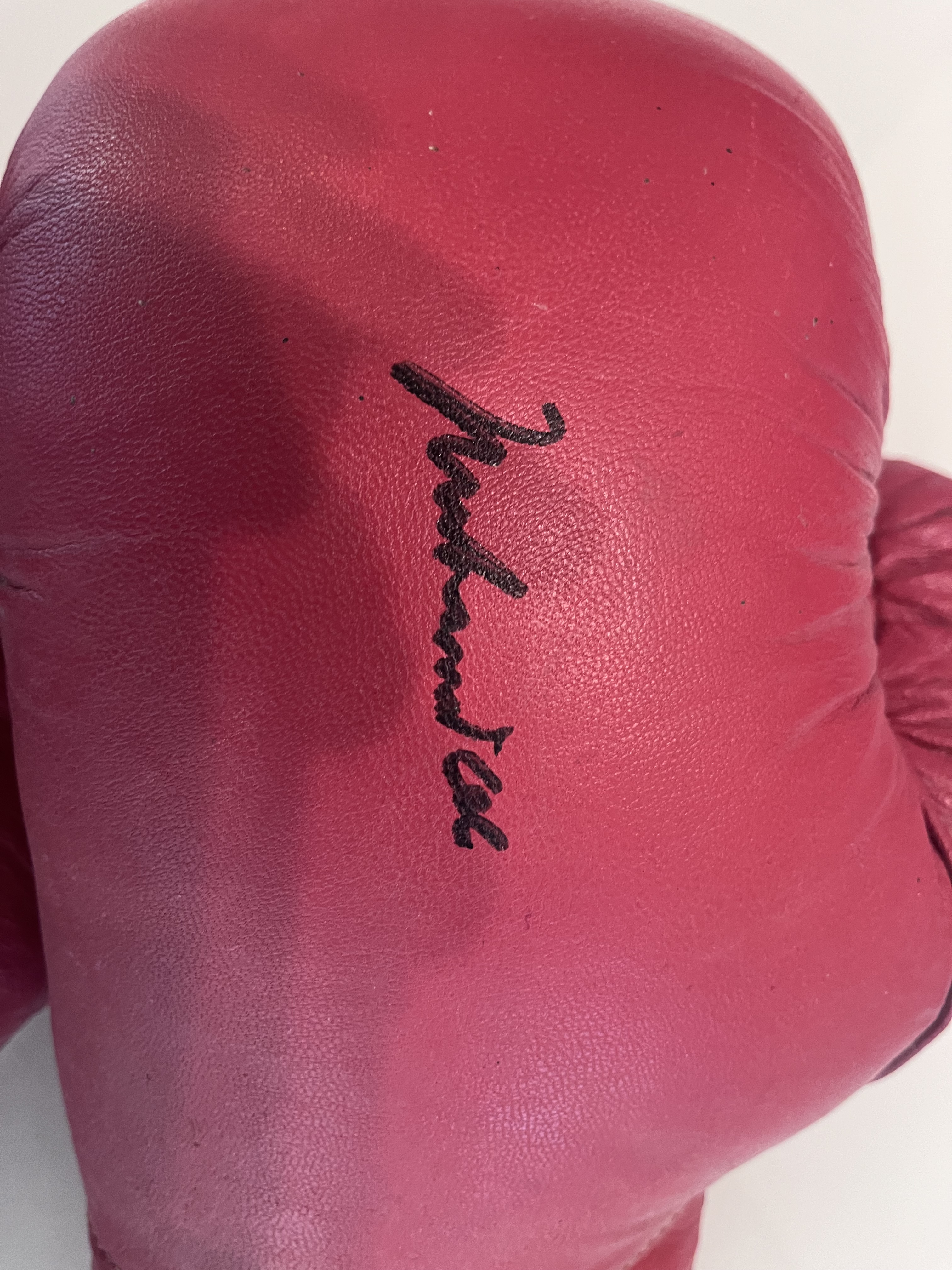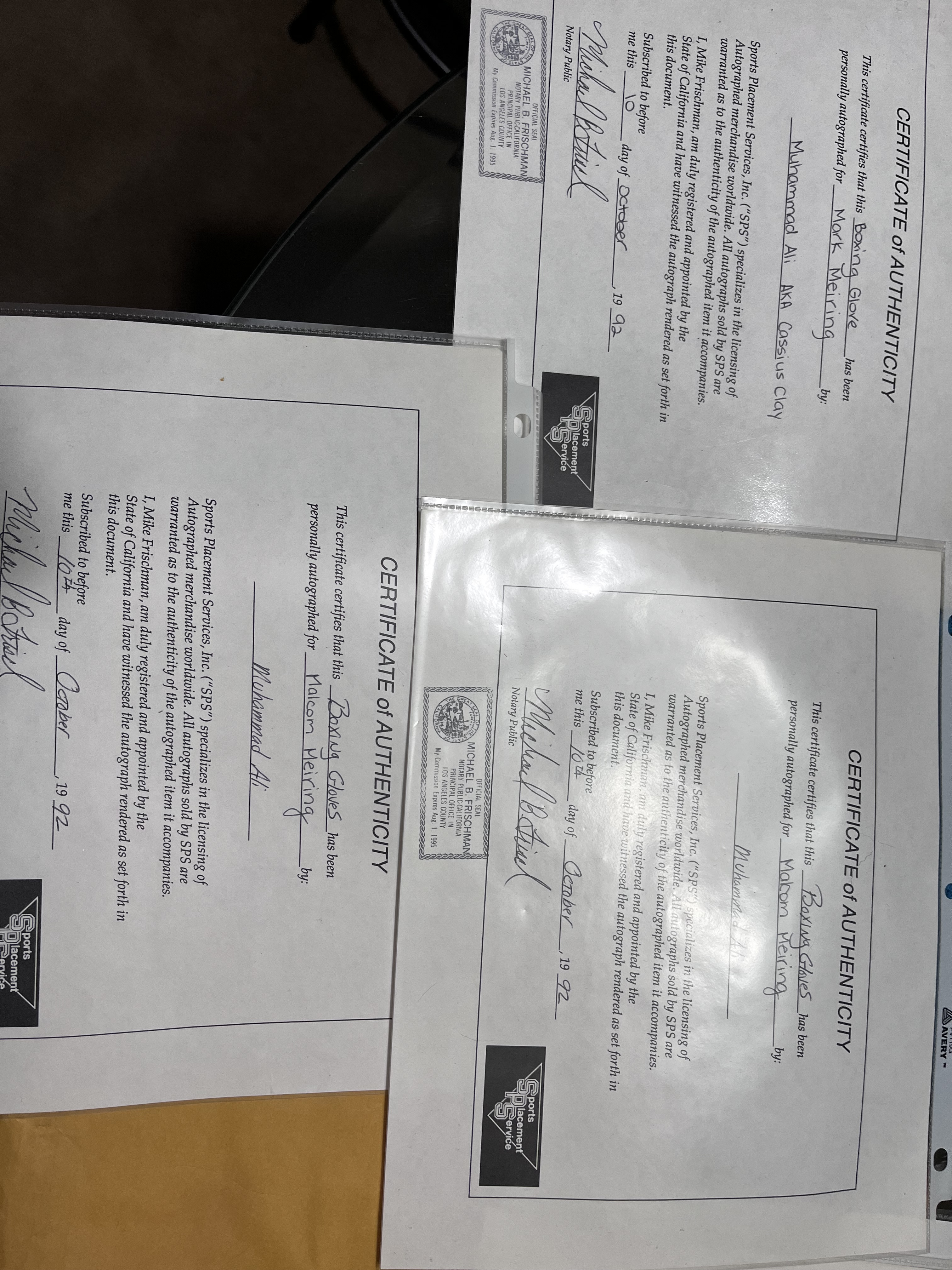 My brother and I attended a sports collectible show at the LAX Airport Hilton back in October 1992. Several major sports stars were signing at this show. Muhammad Ali and Roy Campenella were just a couple of the many celebrity athletes. We had three autograph tickets for Mohammad Ali, and the promoters were strict about asking only for Ali autographs or risk being removed from the show. So we got three boxing gloves and had the first two autographed Muhammad Ali. We waited until he was near the end of his signing time and got in line for the 3rd autograph, at we asked him to sign it Cassius Clay, which he did without missing a beat. We got all three autographs notarized while we were at the show. Now we like to know what they are worth for insurance purposes.