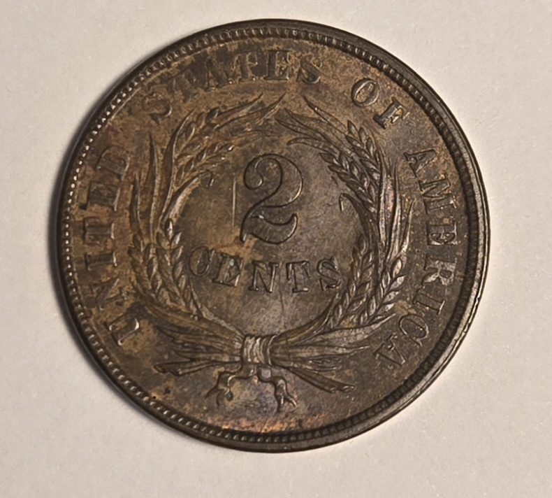 I have a 1864 two cent also that has the reverse rotated 180 degrees.