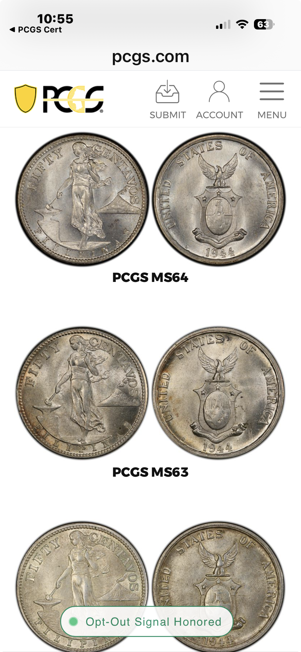 The coin I shared is a 62. https://www.pcgs.com/valueview/fifty-centavos-1903-1945/1944-s-50c-allen-15-01a/1622?sn=516031&g=62&h=coinfacts
