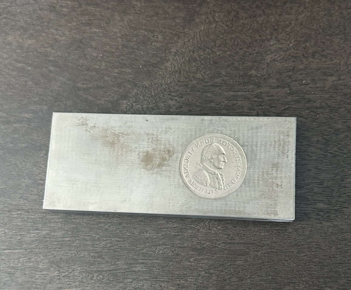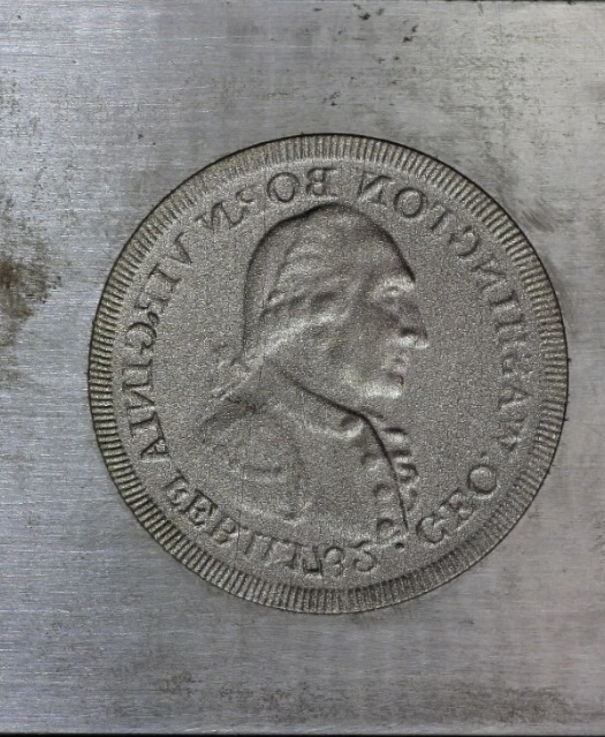 Has anyone seen anything like this before or know anything about this piece? This appears to possibly be related to the 1959 Colis restrikes of the Washington Born Virginia medal. It is a negative impression in a steel bar, and the image of Washington has a different texture and appears granular. The opposite side is blank. On the side of the steel bar there is an interesting mark which looks like a small bar code. Could this be a part of its production? Or could it be a later piece but is somehow connected to the 1959 restrike?