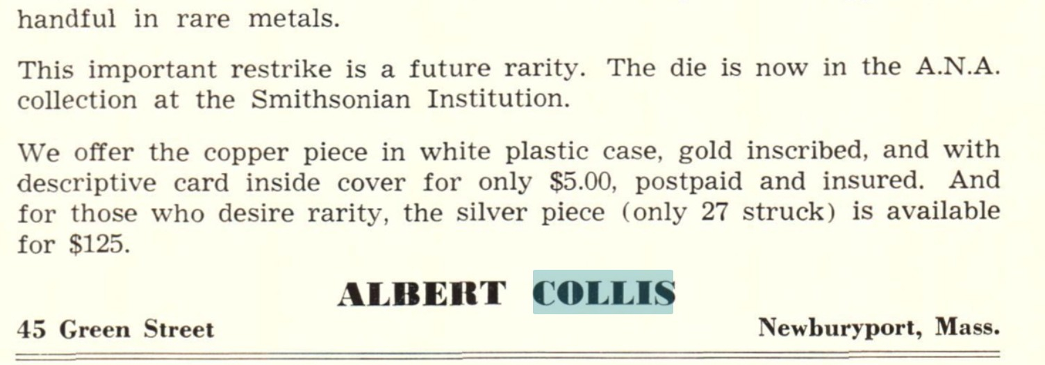 An ad from Collis in the December, 1961 Numismatist. Again it gives the silver mintage as 27.