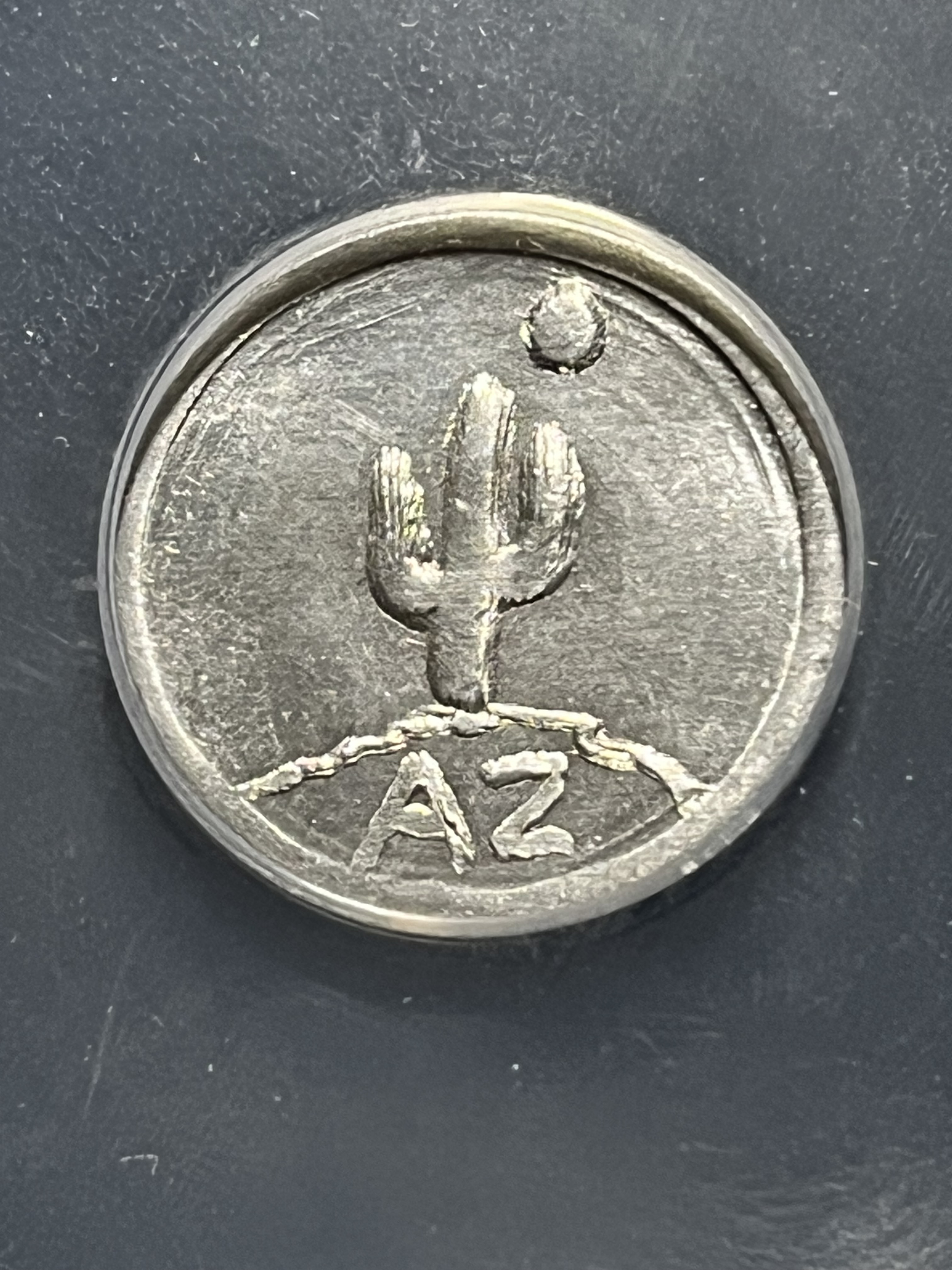 This aluminum token features a cactus and the letters "AZ" on the obverse. On the reverse, it features the date and mintmark below a star surrounded by rays (as seen on the Arizona flag). It was made in the Verde Valley of Arizona, in the year 2022.