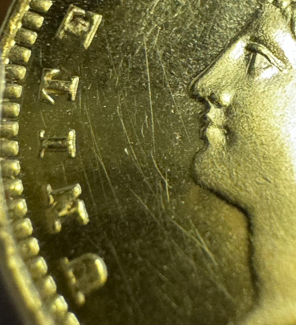 The extent of hairlines surprised me on a 65 CAC (which is why I first thought die polish), but they are barely visible to the naked eye on this minuscule coin, and then only under magnification and certain lighting.