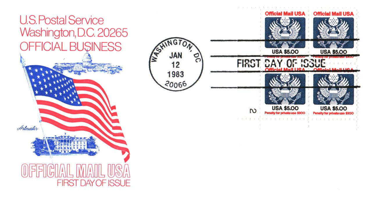 This is an especially interesting one. It's an Artmaster cachet but the USPS return address apparently was how they were able to do an FDC with just the Official Mail stamps. Normally, a "civilian" stamp would also have to be added for the cover to be canceled.