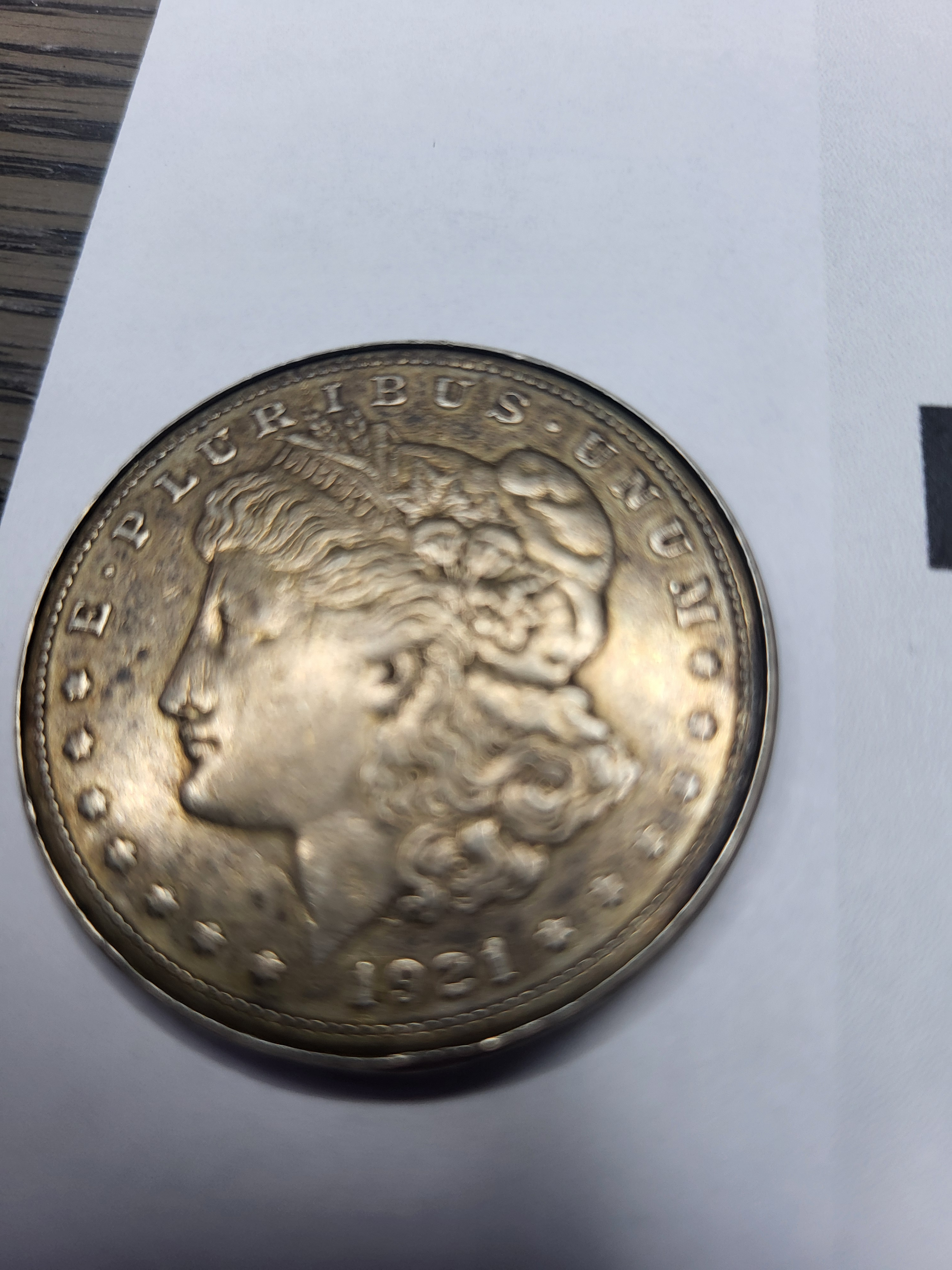 It's blurry, but it seems to be a real coin made into a piece of jewelry.