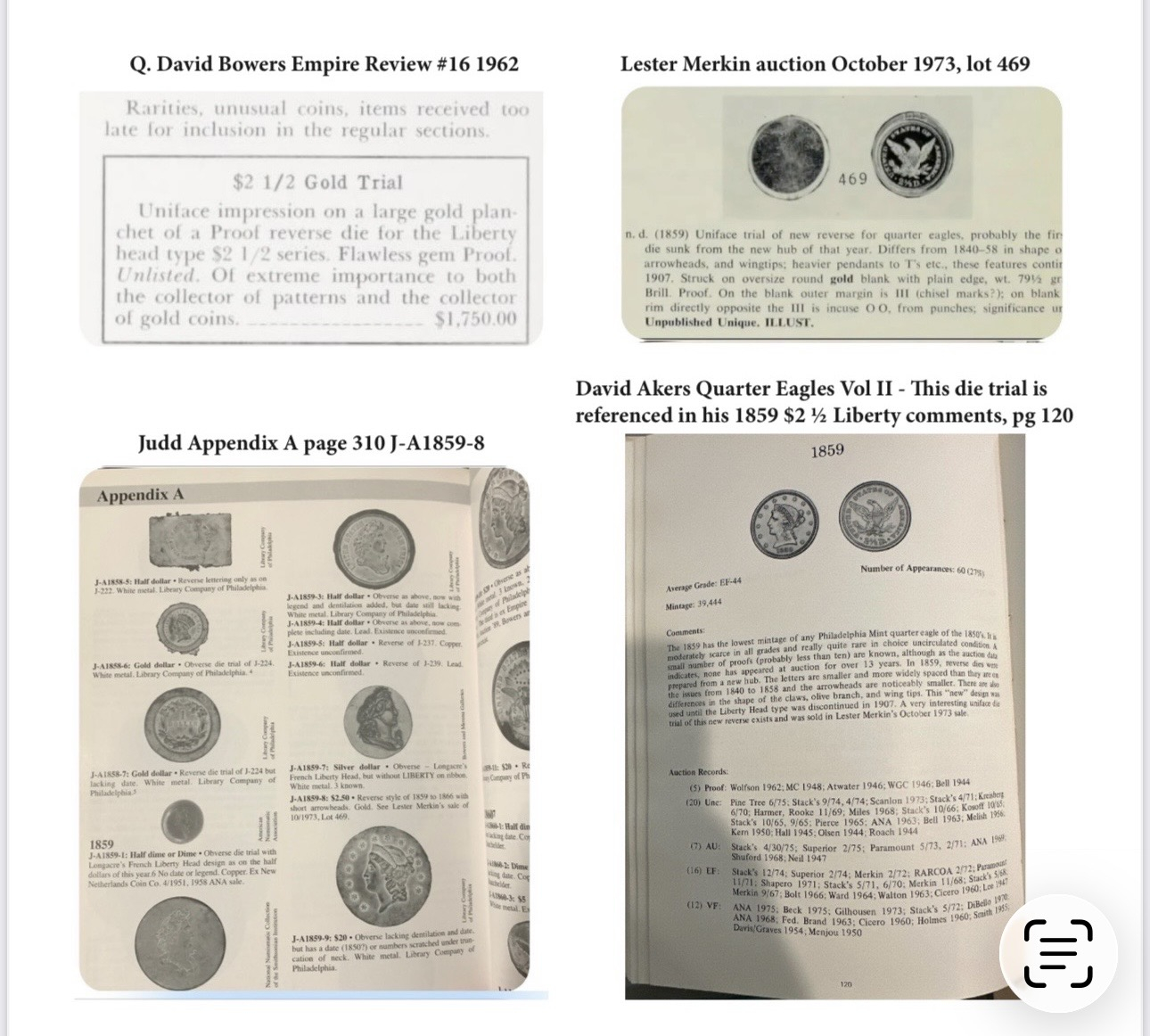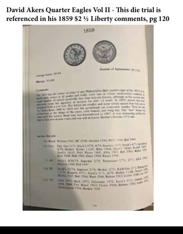 In 1984 at a coin show, Paul showed me this gold die trial. We walked over to David Akers who was also set up at the show. He showed us his $2 1/2 reference book which mentioned this die trial (shown below). We all believed that it was genuine. I purchased it for $5k and showed it to several other experts. Everyone loved it.