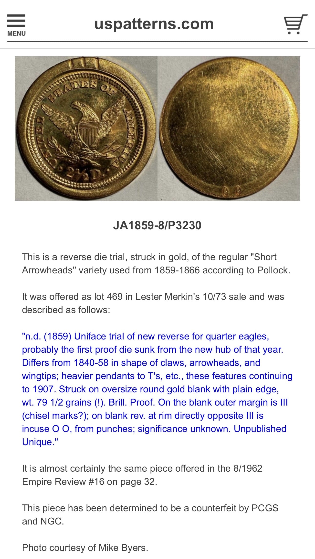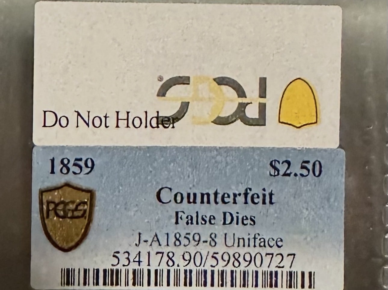 Based on this new information, Saul Teichman of US Patterns updated the page on this die trial, adding that NGC and PCGS have determined that it is counterfeit. I showed it to Andy Lustig ( also part of US Patterns) in person who also determined that it was counterfeit.