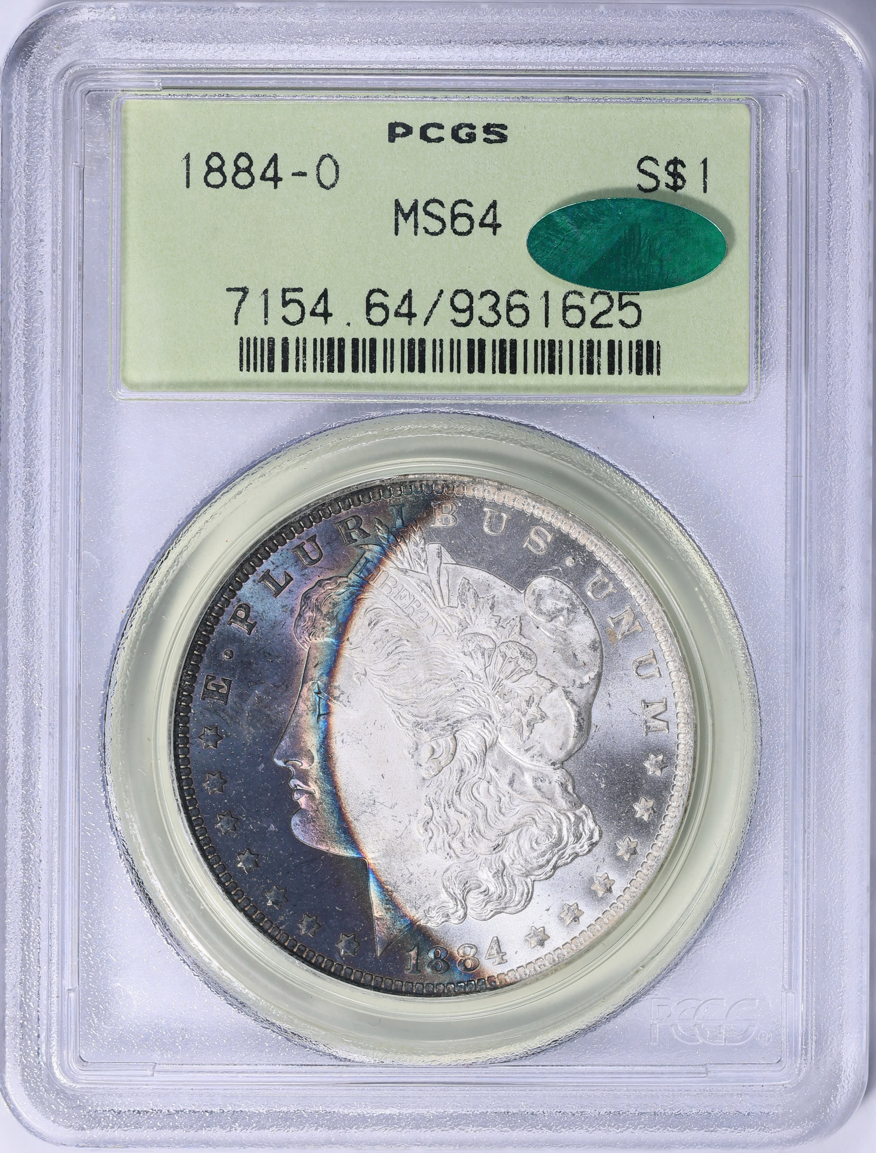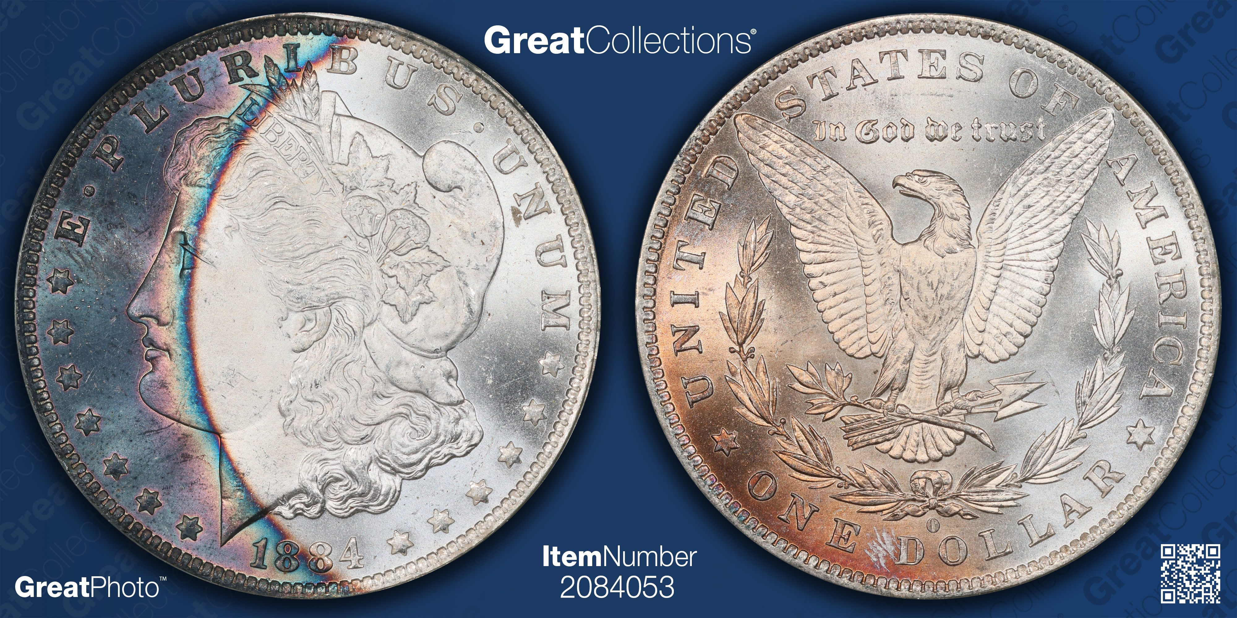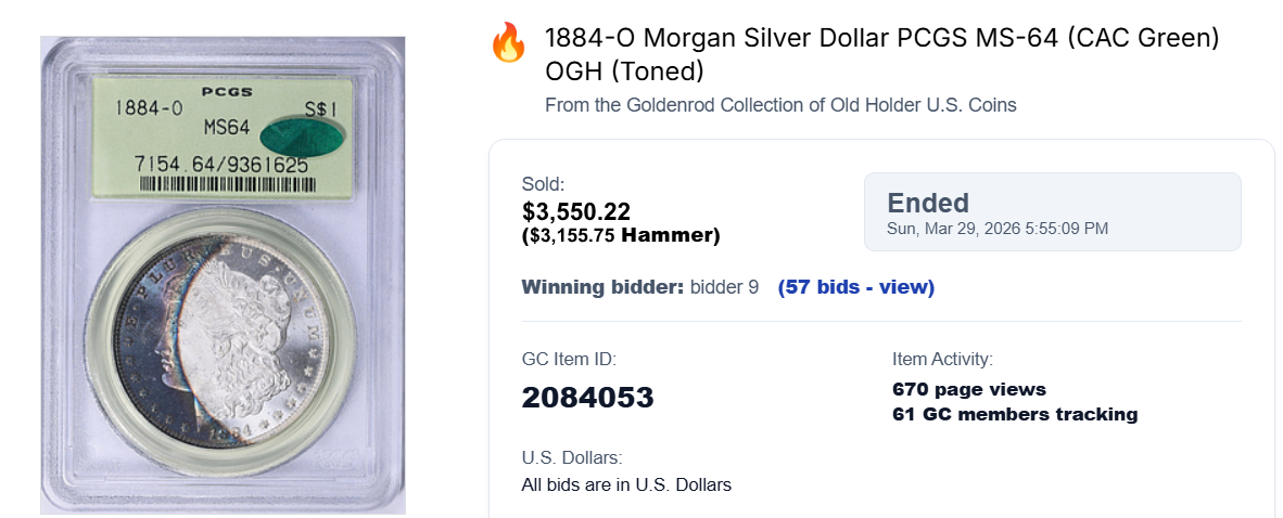 Toned Morgan collector here: I saw that one and am similarly baffled. I would think that’s a $400-$600 coin. It’s an old holder and stickered but it’s not an early rattler or something where the holder should add that much. The contrast is unusually stark, which I suppose is interesting. Grade-wise it looks like at least a solid 65 to me (and probably even better) but it only has a green sticker. And even if it did have a gold sticker (or grade 66) that result still seems high. I own this one that has more vivid color covering more of the coin’s surface and I wouldn’t have valued it anywhere near what the 84-O sold for: