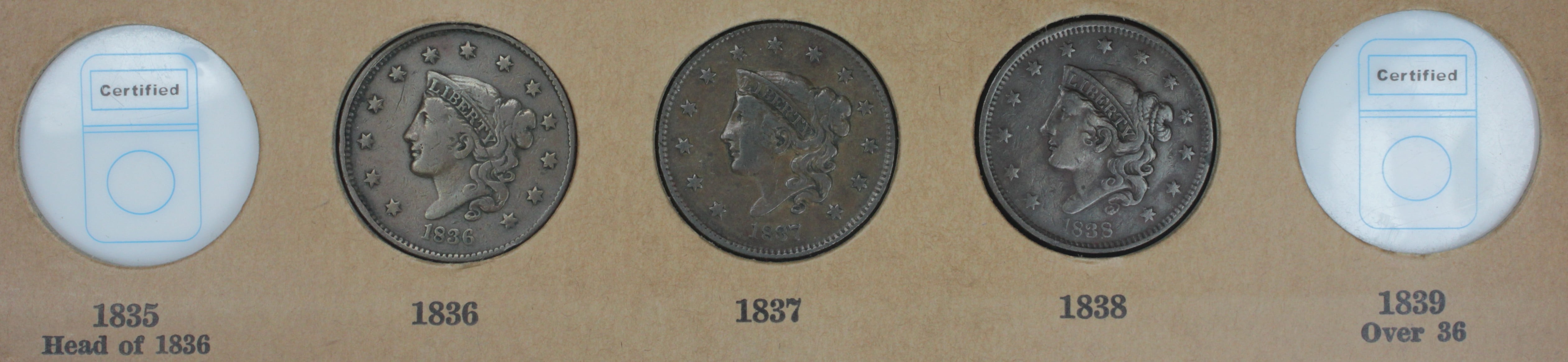 As I began acquiring higher-value coins, I started submitting them for certification. More recently, I’ve also sent in some of my type coins for grading or reholdering. I still enjoy the look of an album, but I also appreciate the protection and liquidity that TPG holders provide. To balance both, I’ve used a few workarounds in my Large Cent albums: plastic proxy coins or lower-grade placeholders to represent coins that are slabbed. This lets me visualize the set as a whole... blank spaces show what I still need, and proxies remind me what’s off in holders. The downside is when I own both a lower-grade example and an upgraded slabbed coin... like my 1839 “Booby Head” large cent... it breaks the continuity a bit.