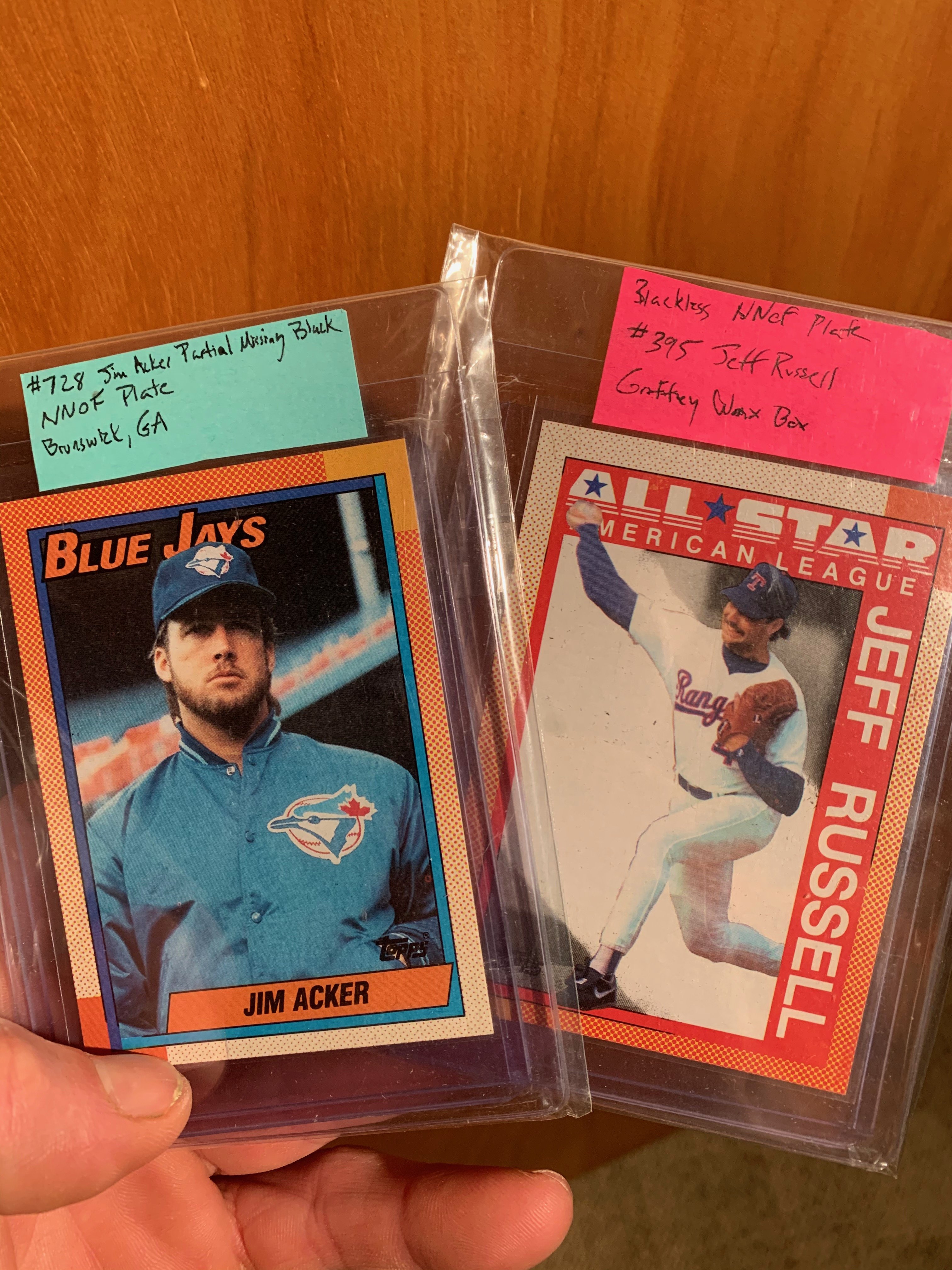 Sheer force of will and reading every scrap of NNOF research available on the internet was not going to transport a NNOF into a pack for me. My other plan running concurrently with the unopened pack buying was going through and finding every person in the world I could find who had ever pulled a NNOF, and pestering them to either go through their collections looking for errors, or outright buying their cards and finding them myself. I was really scrounging here, but managed to get my first break in late 2017 buying a binder from a guy in Brunswick GA that had a John Hart (later traded to Brian Gerrans for a Russell) and a Jim Acker. This was the first breakthrough in my journey but also my first major mistake, as I passed on the opportunity to buy a mint, ungraded NNOF for $3500 (felt like too much at the time).