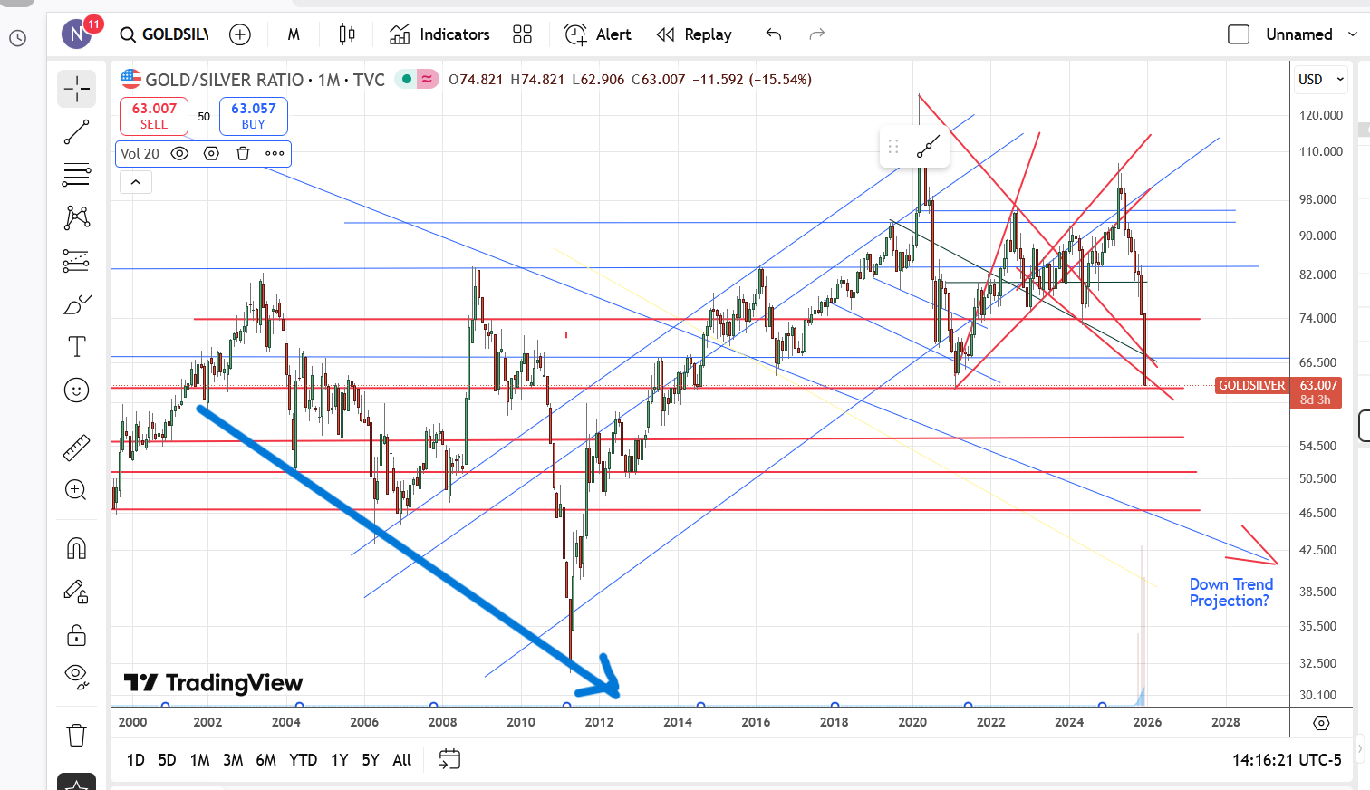 The chart is the sum of all market knowledge. Doesn't matter to me if some trends lines are 15-20 yrs old if they have legitimacy. If we're tossing out old charts then you might as well toss out silver's cup formation from 1980 to 2011. That goes back 45 yrs. The handle took 14 yrs to play out. Once $50 was exceeded for the 3rd time, the chart exploded. Hard to find a chart with more credibility than that one.