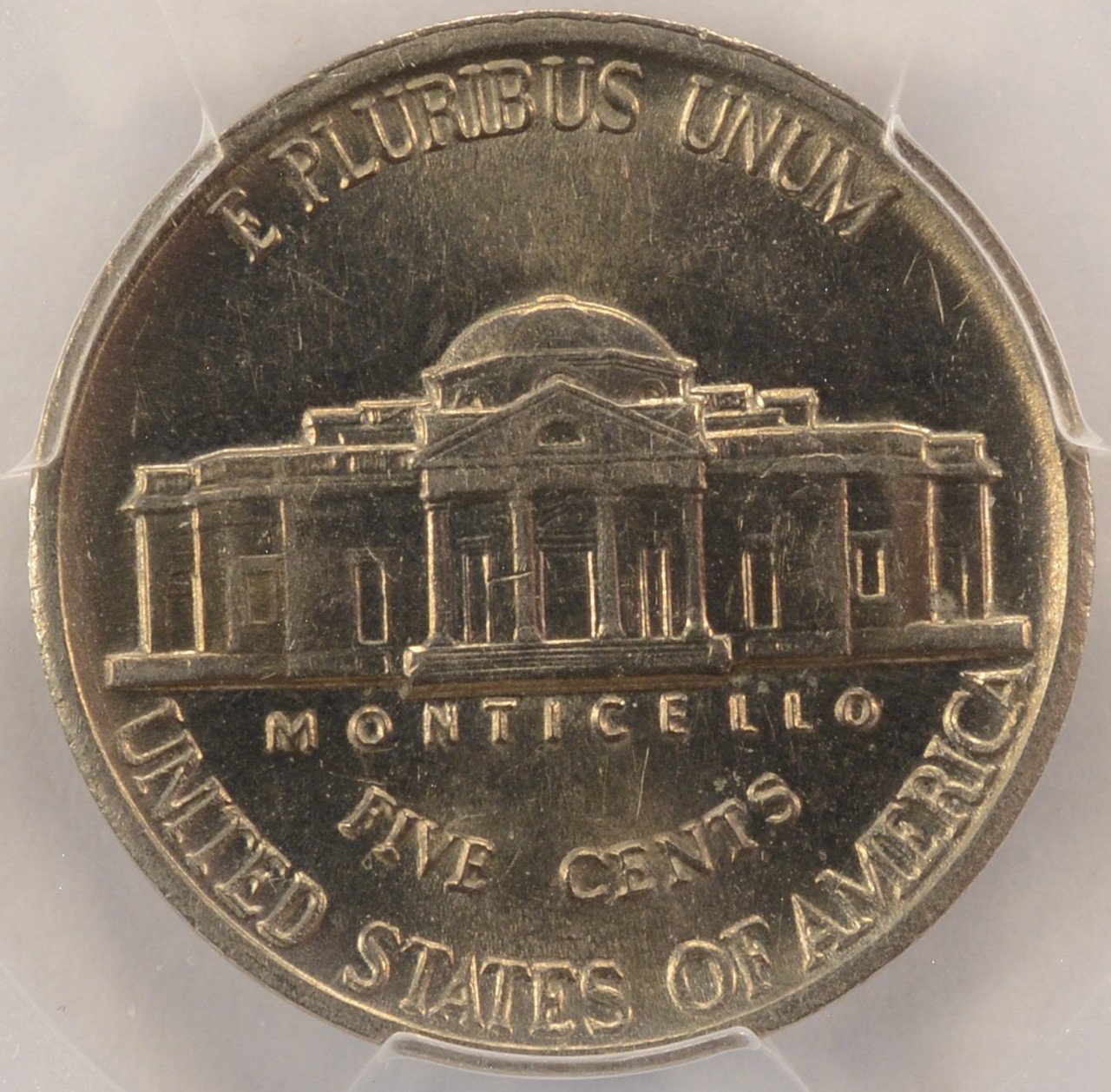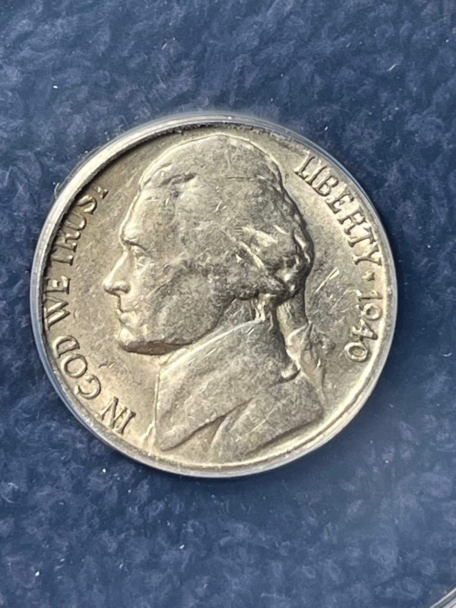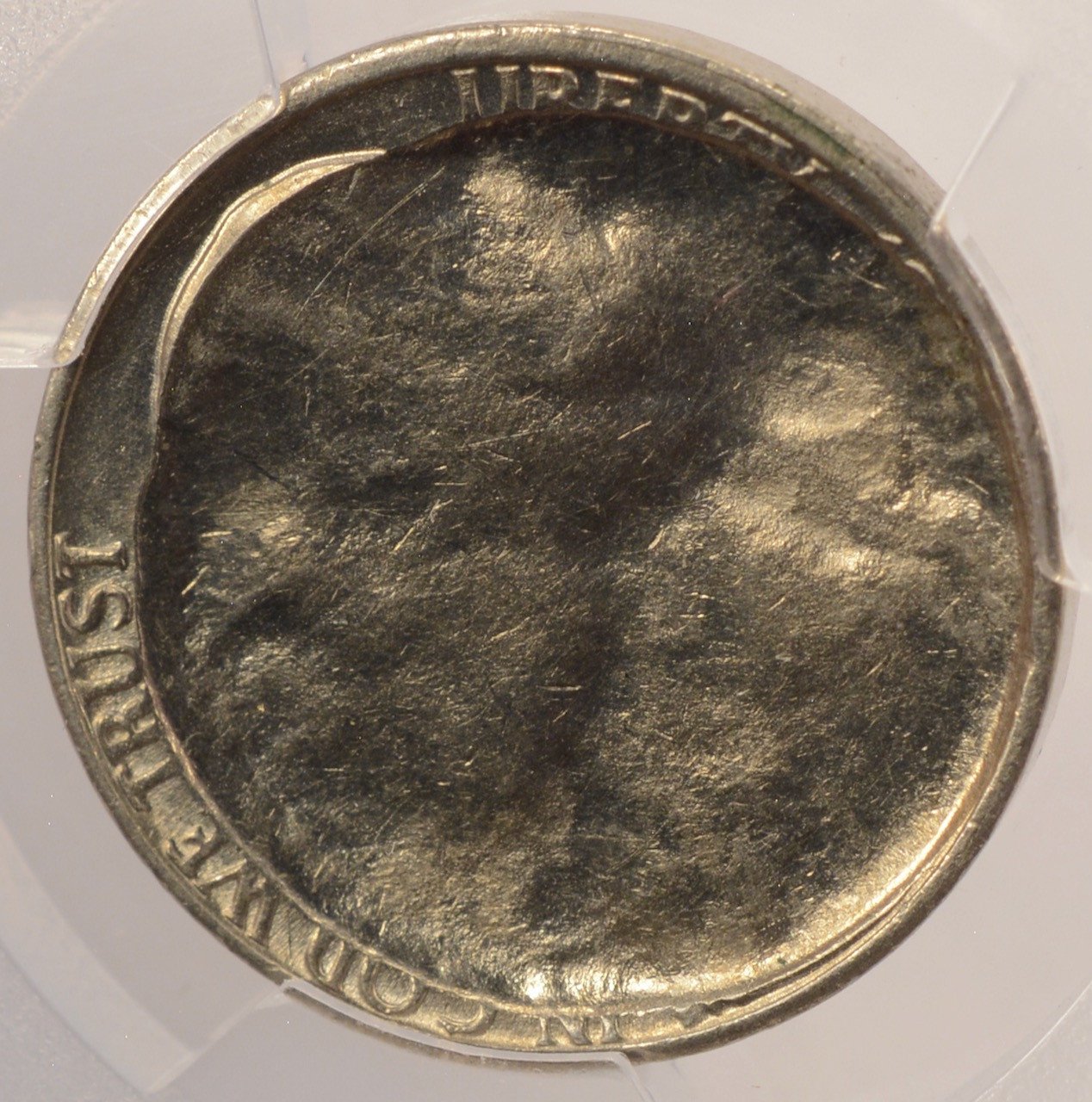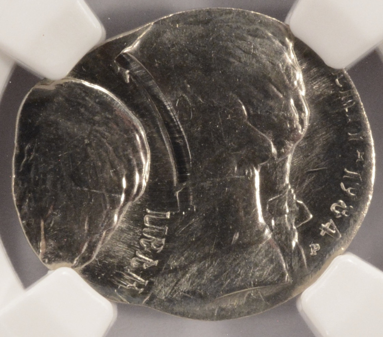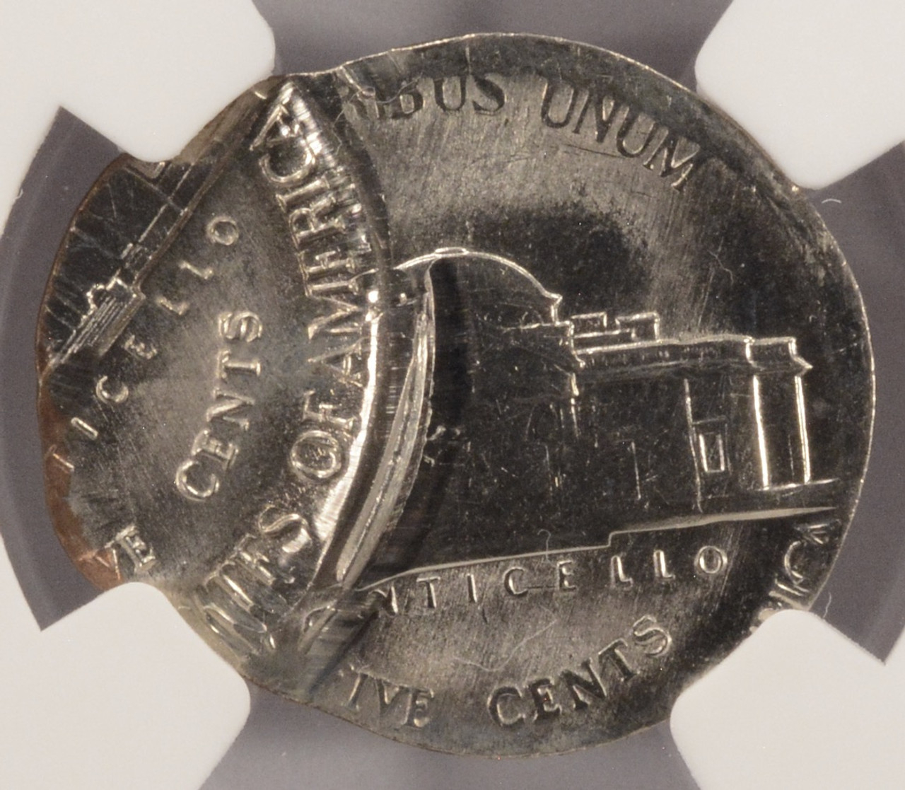 PCGS 19xx Jefferson nickel indented by a Roosevelt dime planchet. The indent is close to a dime size, with a slightly larger size because, when it was struck, it expanded slightly in size.