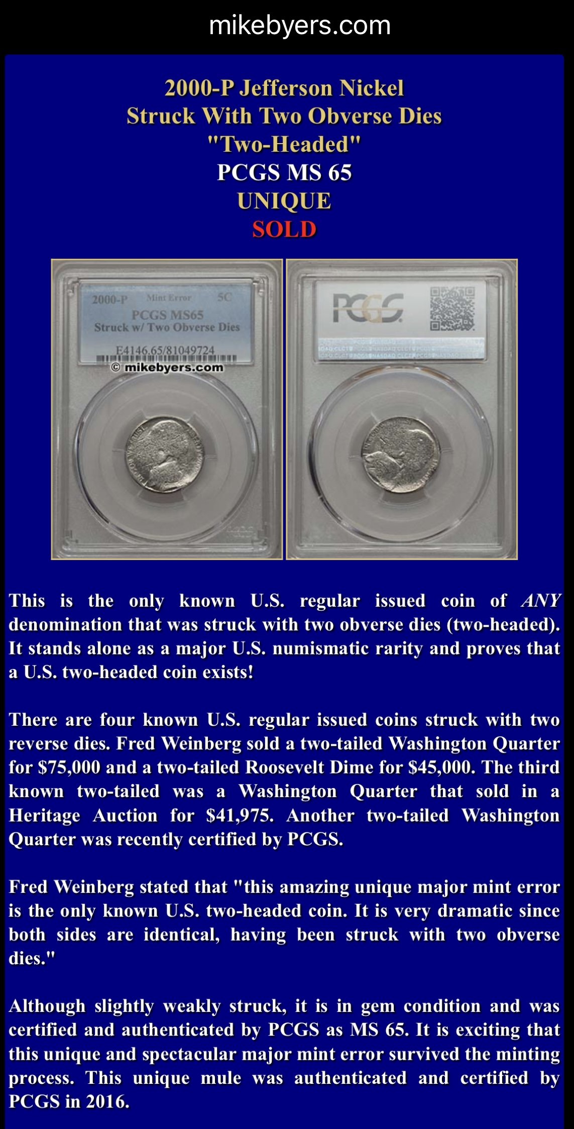 mikebyers.com Dealer in Major Mint Errors, Die Trials & Patterns - Author of NLG Best World Coin Book World's Greatest Mint Errors - Publisher & Editor of minterrornews.com.