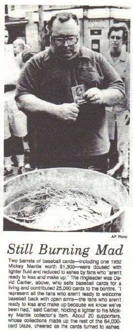 And to really sell the drama, he held up a 1952 Topps Mantle — then valued at around $1,300 — and tossed it into the fire like it was a common. The Associated Press even snapped a photo of him looking proud, as if destroying a Mantle was going to bring the owners and players back to the table. Spoiler: it didn’t.