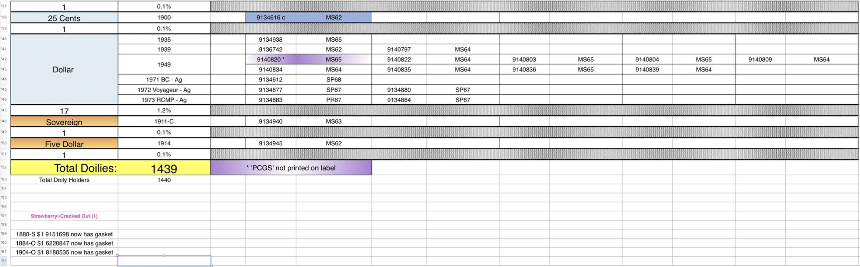 Will be adding totals in the next iteration - so far Doilies make up .002% of the 31 million coins graded by PCGS (648 Doilies reported to date).