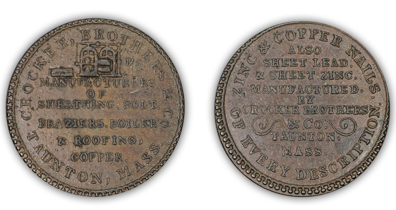 Crocker Brothers was the first American source of planchets for large cents and half cents (beginning in 1832 according to Bob Julian, 1833 according to Dick Doty), and the sole source after 1838. The token that I posted above actually depicts a tiny Crocker Brothers employee in long work gloves operating a sheet metal rolling mill, just the kind of machine that would have allowed them to roll copper ingots into sheet for use on large cent planchets.