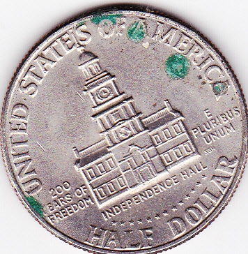 While searching the bicentennials I found an unusual one that is slightly larger diameter than the other ones.It has a couple pewter like aqua color corrosion spots on it.It was the only one larger and isn't an S mint.Anyone have any ideas as to why it would be bigger?