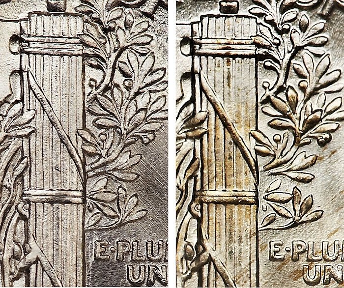 Here are central detail images of 1916-P (left, #1152-3441) and 1925-P (#1136-2490) dimes showing the most obvious differences in original and replacement master reverse hub. Also, note that the 1916 coin shows considerable manual engraving in this area, particularly in extensions of branches to the fasces. (Photos from Heritage Auctions’ archive; HA.com)