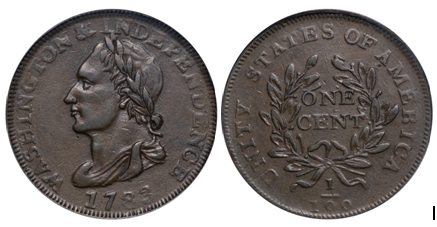 Washington Unity States token (or cent), dated 1783. These tokens were likely produced by the Soho Mint (Birmingham, England). They circulated in England, valued at 1/2 P, and in the U. S. they circulated with the value of a cent in the early half of the 19th century. The obverse, however, does not look anything like Washington; the profile seems closer to that of the Duke of Wellington. The reverse mirrors that used on Draped Bust large cents (but note the use of UNITY instead of UNITED), and this suggests that these pieces were made in the early 19th century. They are mentioned in 1850-ish publications concerning circulating counterfeit coins.
