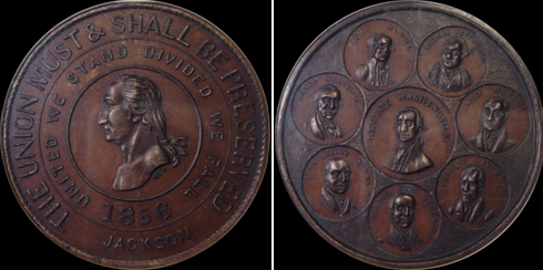 1856 Washington-Eight Presidents medal. Bronze, 47mm, R-8. The reverse depicts George Washington, surrounded by the next 7 presidents: John Adams, Thomas Jefferson, James Maddison (sic), James Munroe (sic), John Quincy Adams, Andrew Jackson, and Martin Van Buren.