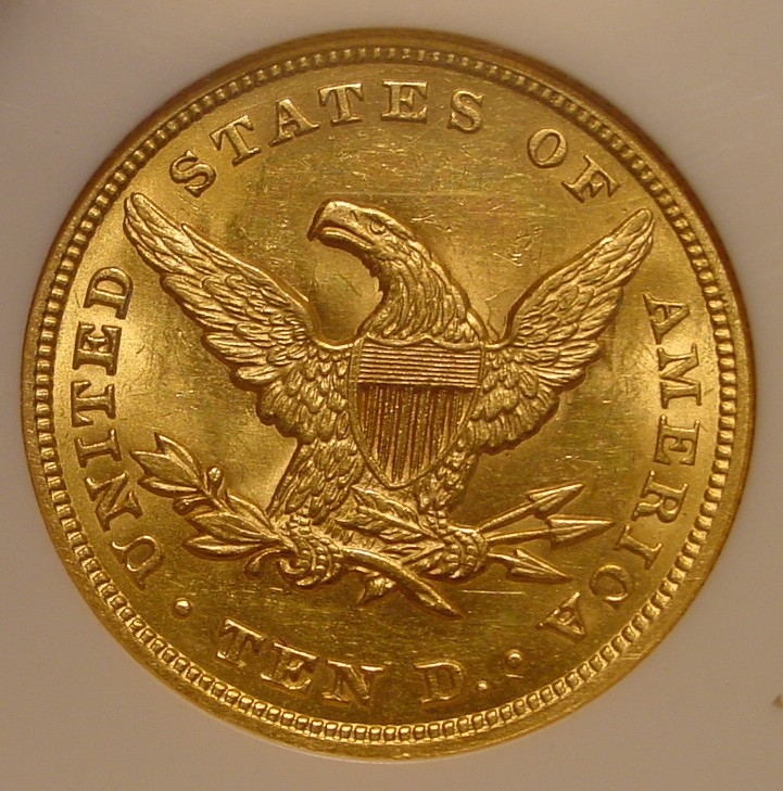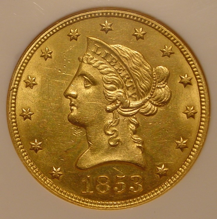 The No Motto $10 gold coins are wicked tough in high grade. The reason was that they represented a lot of money in those days, and most collectors could not afford to save them in quantity. Look at this way. If you were a collector in the 1850s, which would you rather have, a modern $10 gold coin or a nice group of collector coins that $10 could buy.