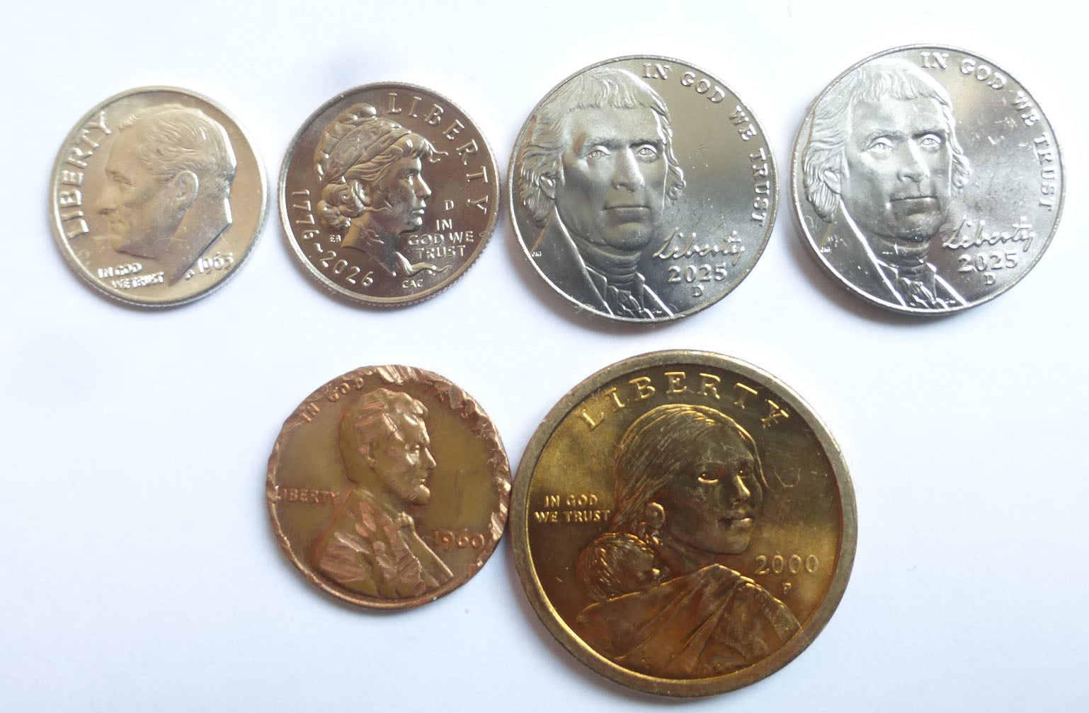 My first 2026 issue - dime, a silver 1963 dime, and a nicely toned Sacagawea Dollar