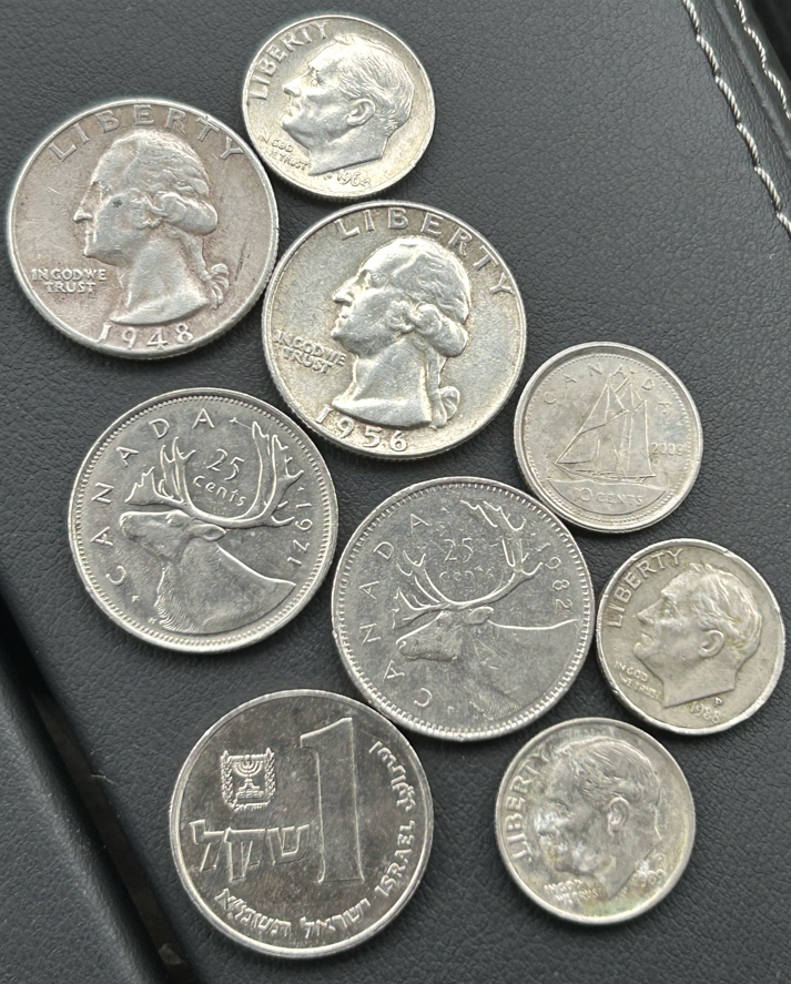 Momma hit's again. A 1948 and 1956 Gutter metal quarter, 1964 gutter dime, $0.60 Canadian, $0.20 clad and an Israeli 1 Shekel. Crazy part is these were all sitting on the top shelf by where you dump the coins in, not down in the reject slot. At current melt just the gutter alone is $31.68. Who would just leave that laying there? I guess some peeps are just oblivious. RGDS!