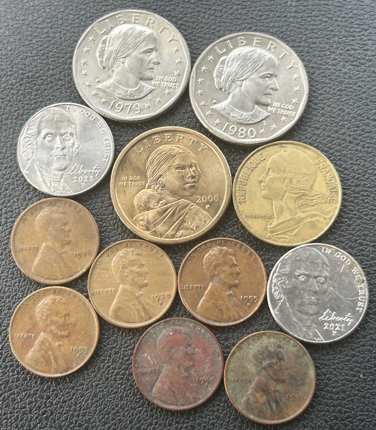 Momma's haul again, I was personally 0-2 on the day. She yielded 2 SBAs, a SAC, 2 clad nickels, a 1963 French 20 Centimes and 6 Wheaties: 1926-P, 1938-S, 1944-P, 1946-P, 1953-D, 1955-D