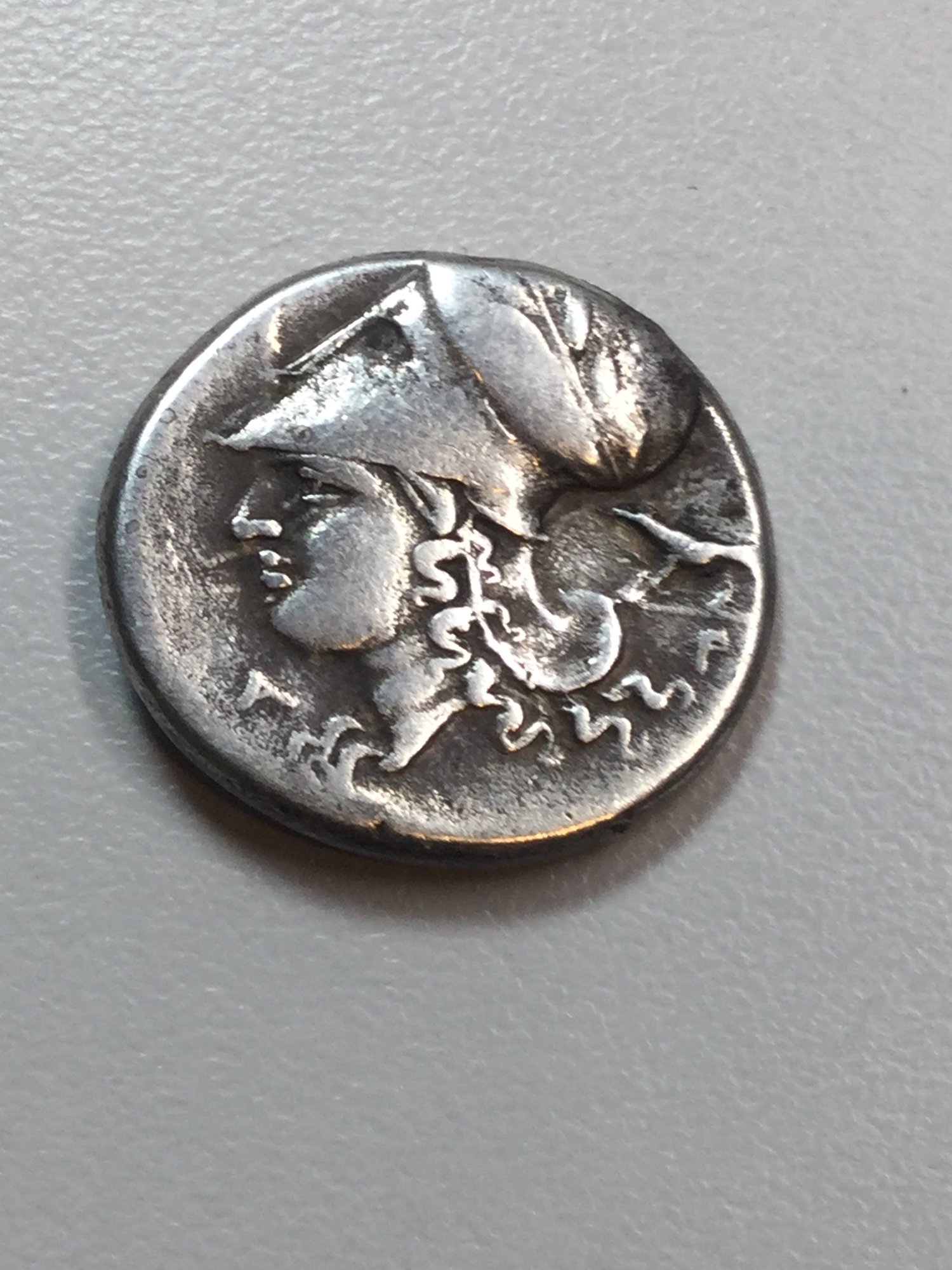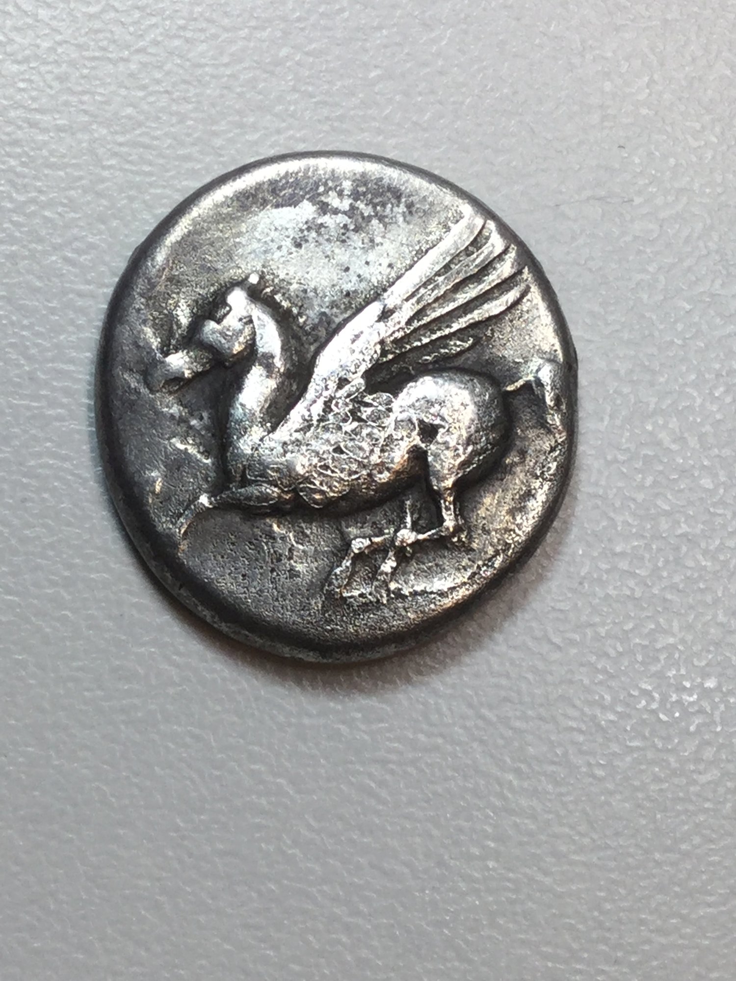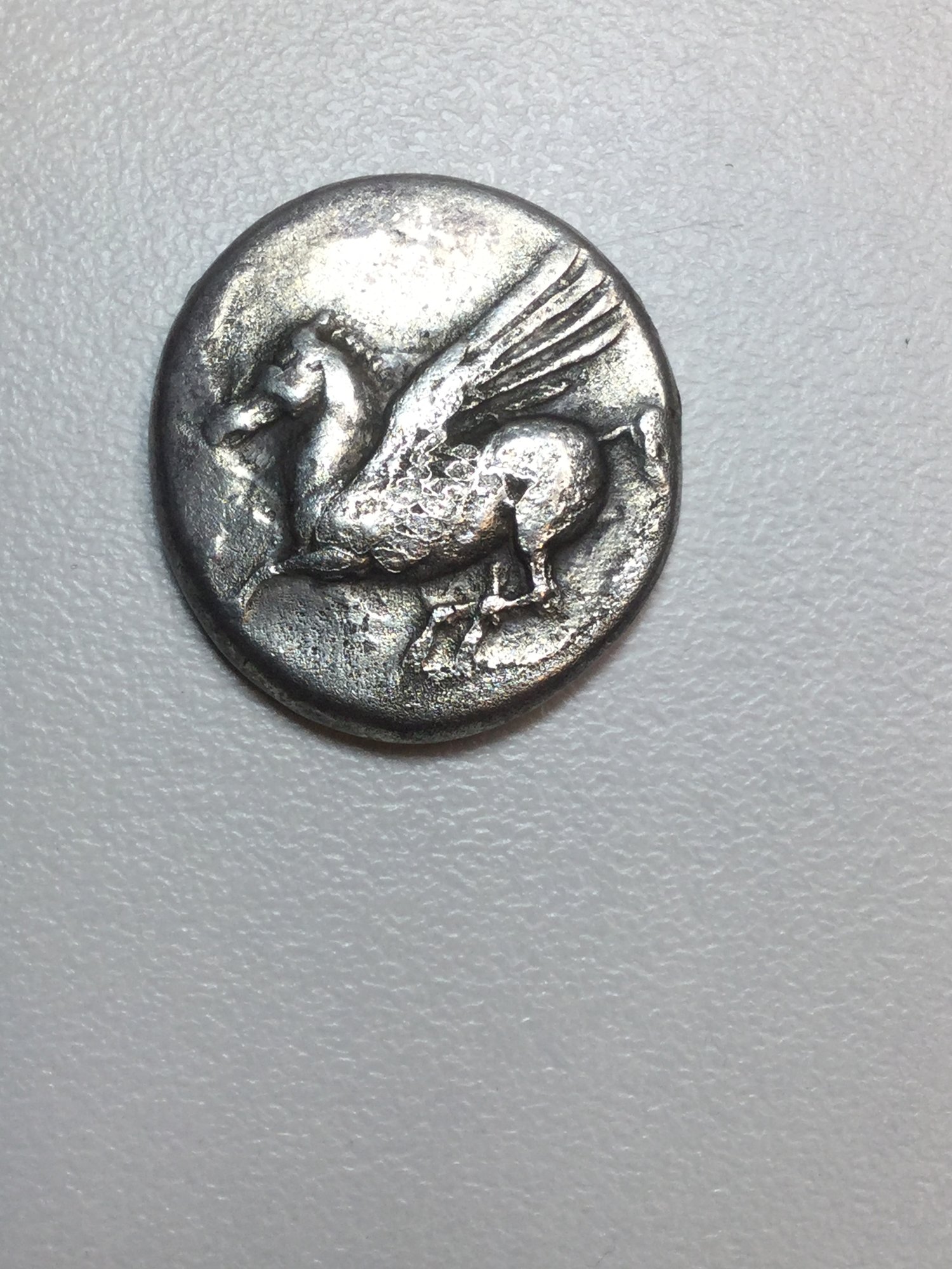 Looks like a Corinth drachm (or maybe a Stater?) That's a Corinthian helm she's wearing. I think that's Athena and of course, Pegasus. Not too good at grading ancient greek, but perhaps VF? That's a nice coin. What's weird is I could swear I either owned that coin (the exact same one), or I almost bought it. How did you get it?