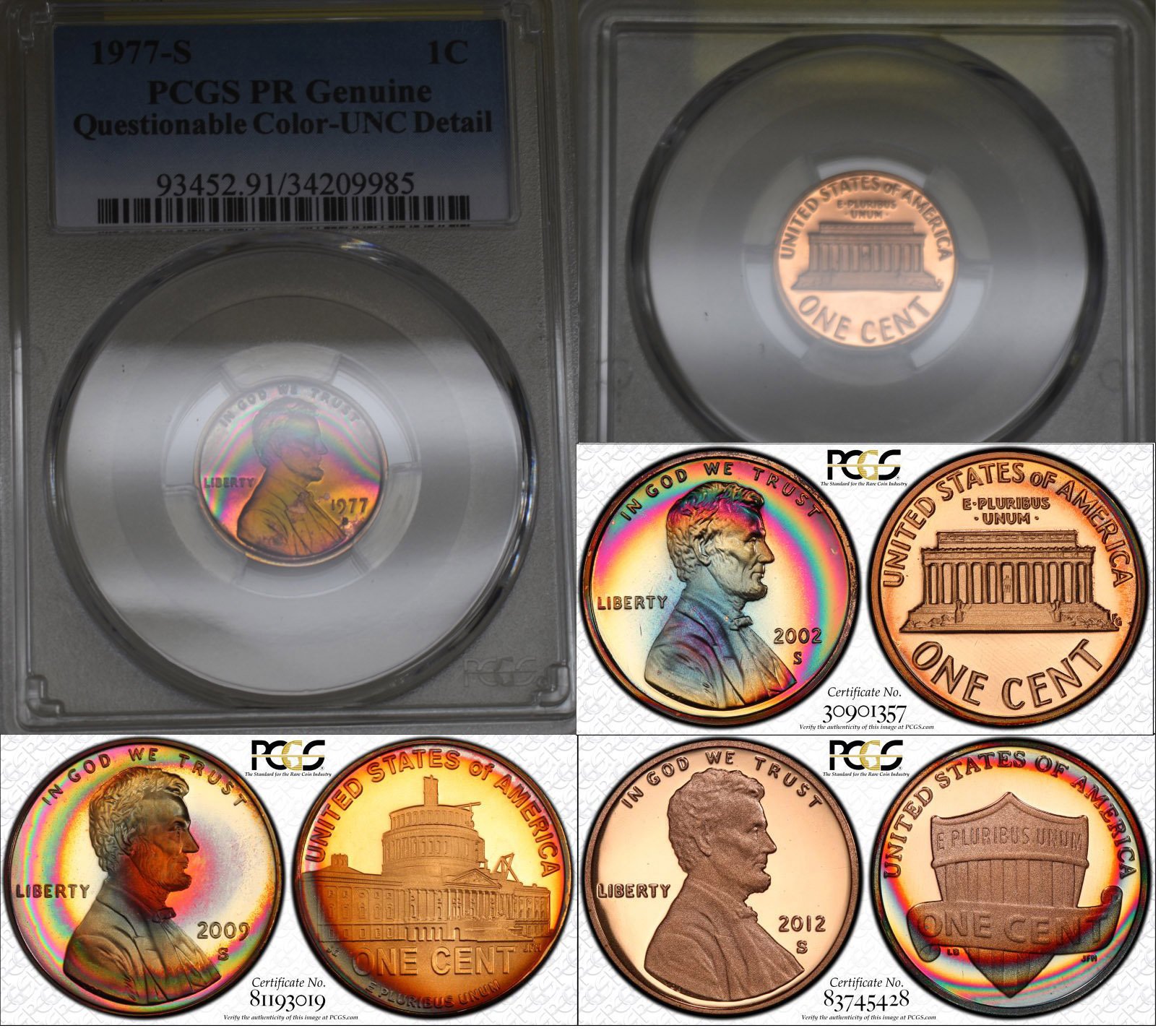 For the 1976-S 1c shown as QC, graders tend to be very suspect of such strong differences between obverse and reverse toning based on how the mint packaging tends to tone coins. There have certainly been exceptions, that's for sure! This may be the graders erring on the side of caution. The 1981-S that the 76-S is being compared to, I guess, seems to have a more natural looking progression of color where the blue looks to be just in the fields (much more difficult to fake which lends to it being blessed). For the 1974-S, the images are not good enough for me to judge. When comparing photos, it would be nice to compare TV to TV.