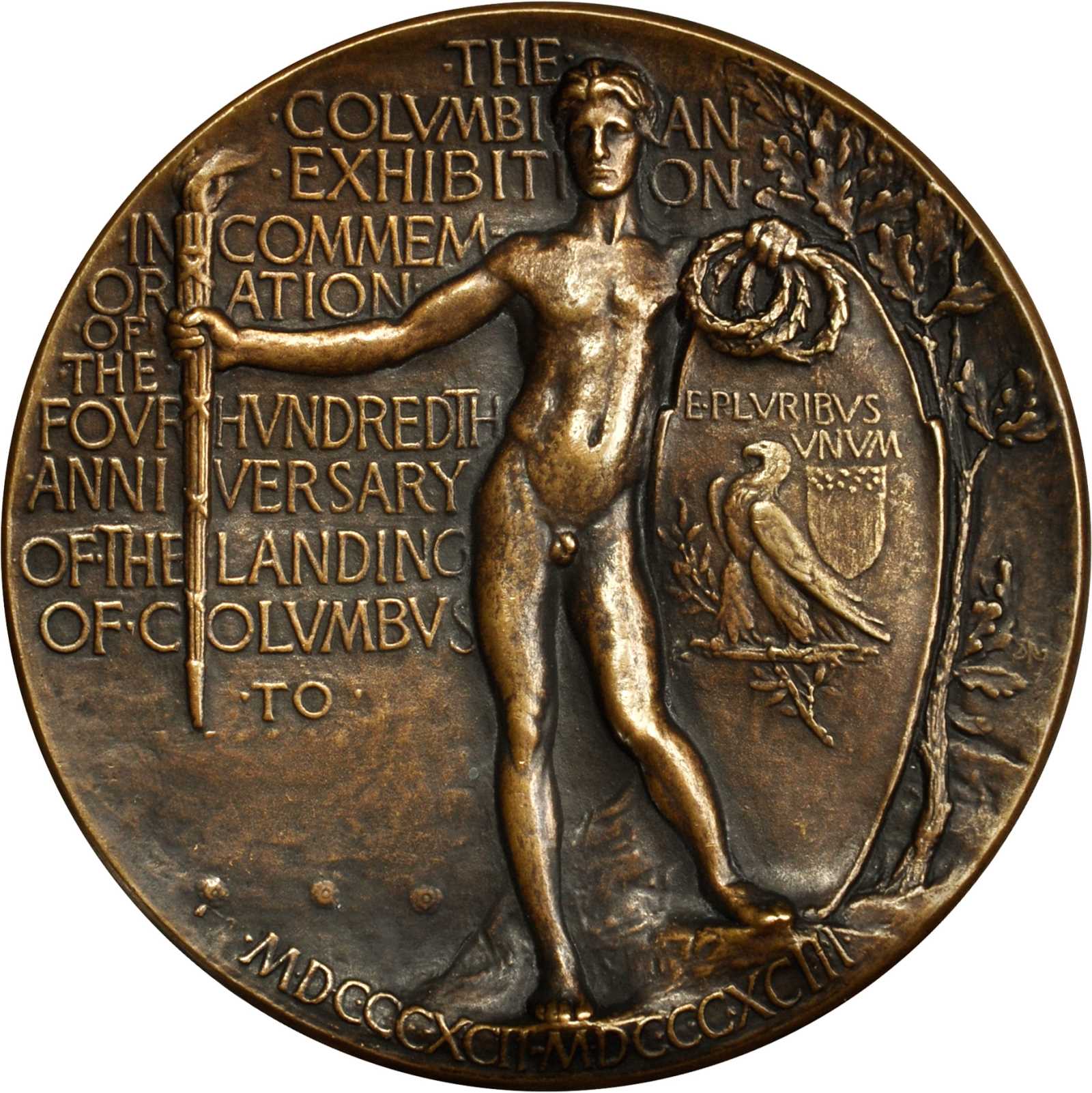 Saint-Gaudens, who served as an advisor for the Chicago World’s Columbian Exposition sculptural program, accepted the commission for the official award medal. He had completed his design for the medal by the time of the fair’s closing in November 1893. His design for the obverse met ready acceptance. It shows Columbus alighting on the shores of the New World. At the lower right are three male figures, one bearing an unfurling banner, and above them are the symbolic Pillars of Hercules with the three Spanish caravels and the inscription plvs vltra. His concept for the reverse, however—a nude male youth representing the Spirit of America—was deemed improper by United States Senate Quadro-Centennial Committee. Two variant designs with the figure’s genitals covered and a third with a wreath-encircled eagle and inscription were also rejected. In the end, Saint-Gaudens’s obverse was muled with a design for the reverse by Charles E. Barber, longtime chief engraver at the United States Mint.