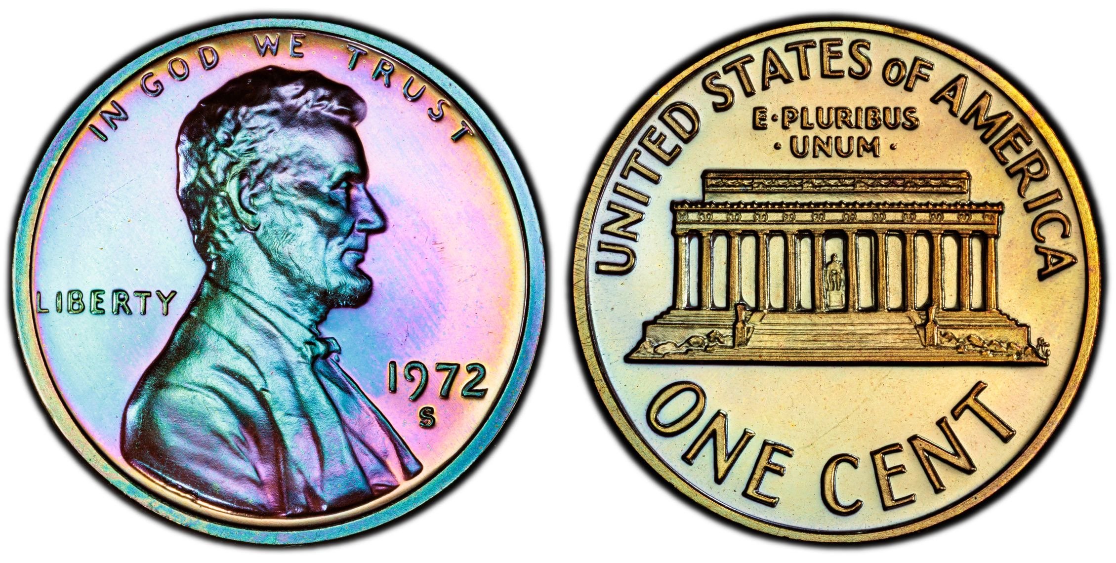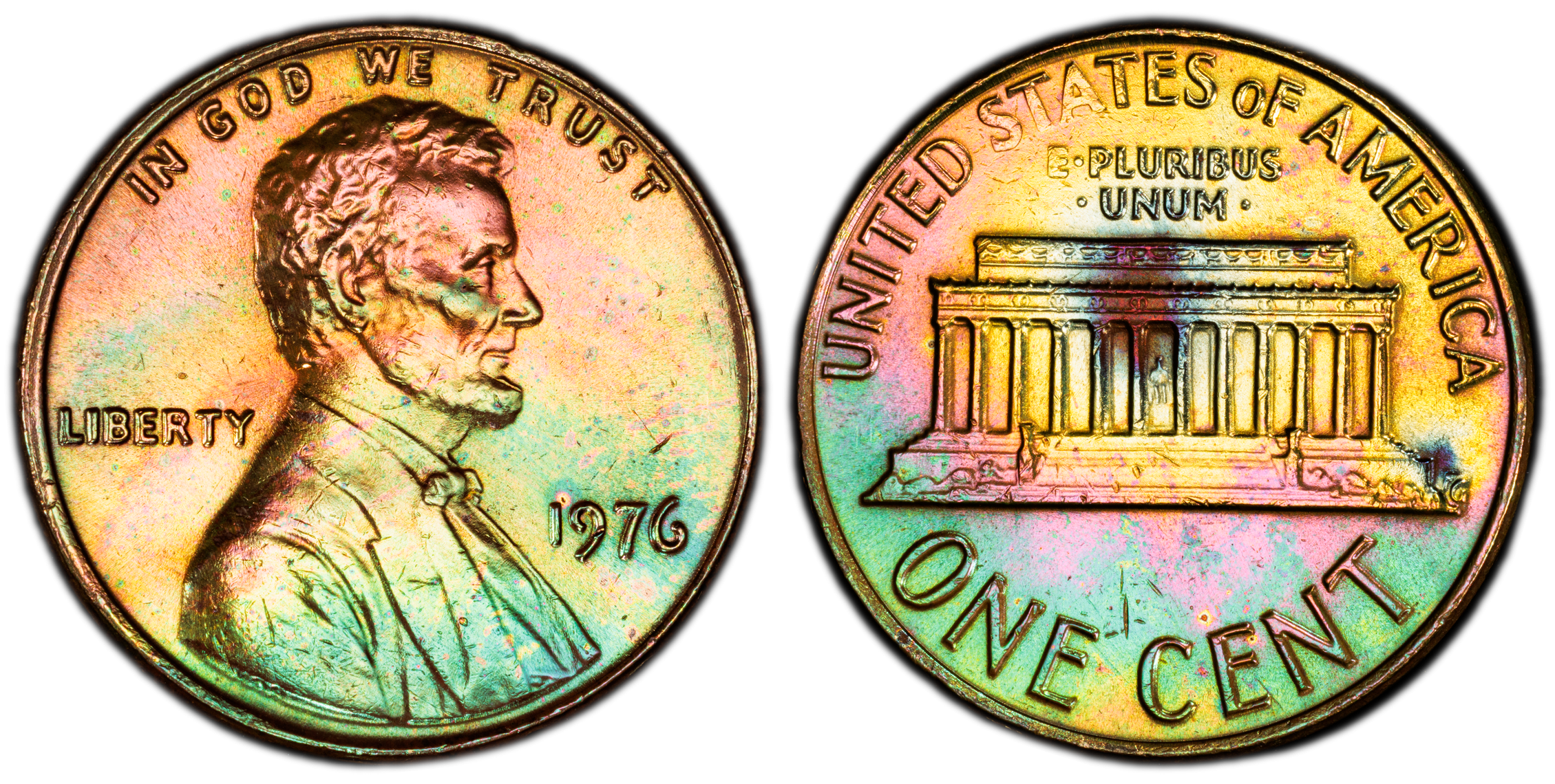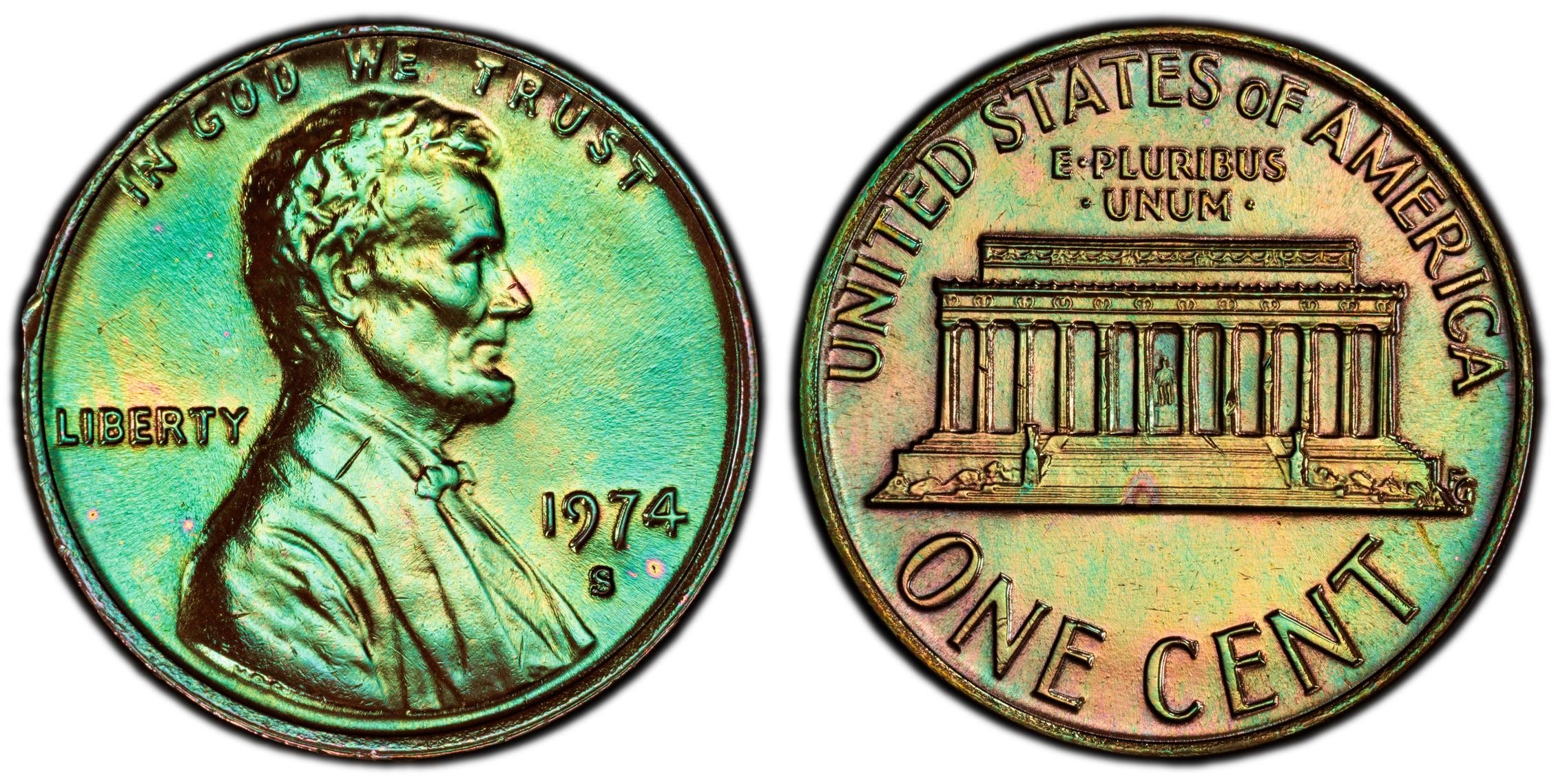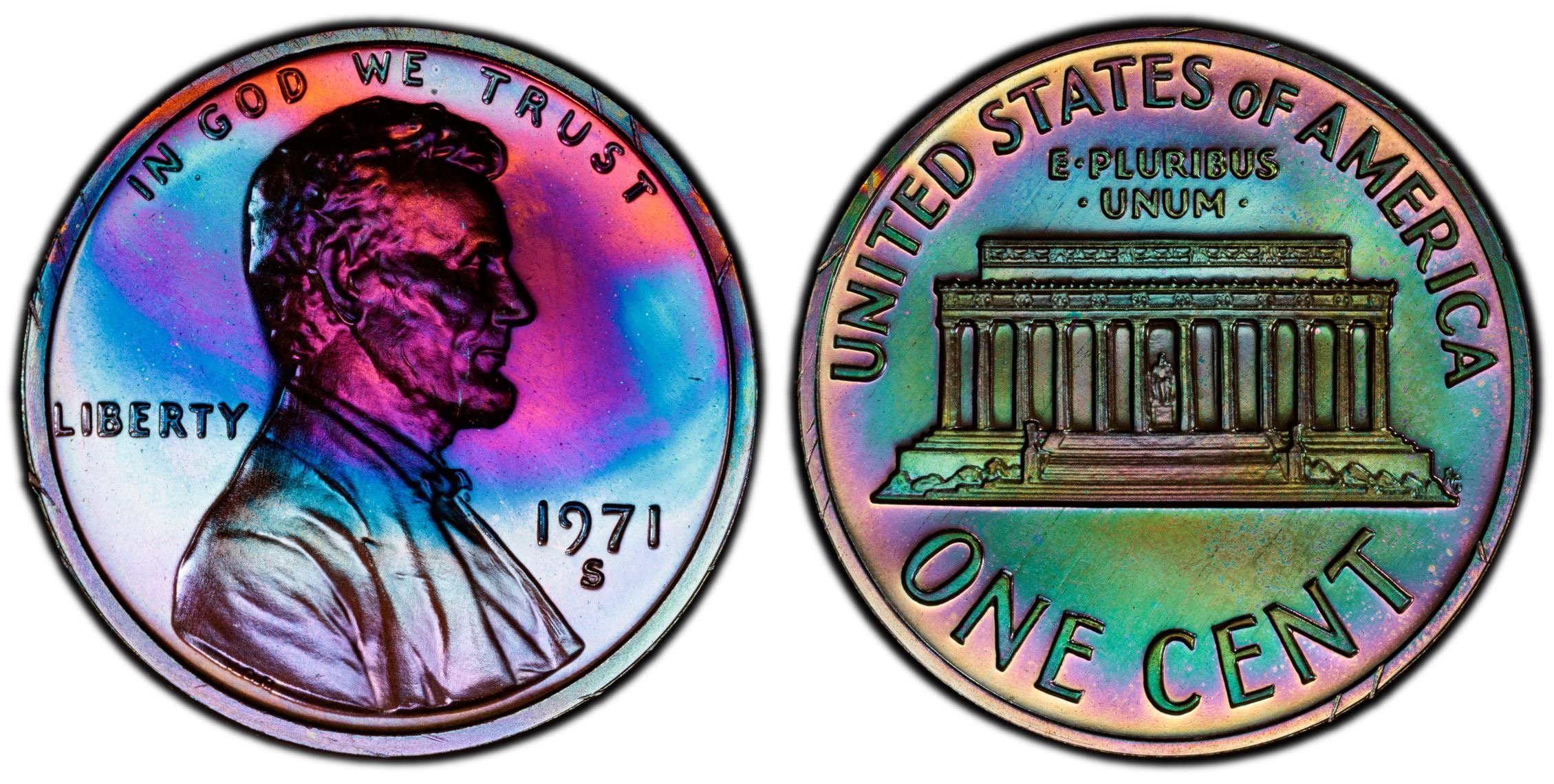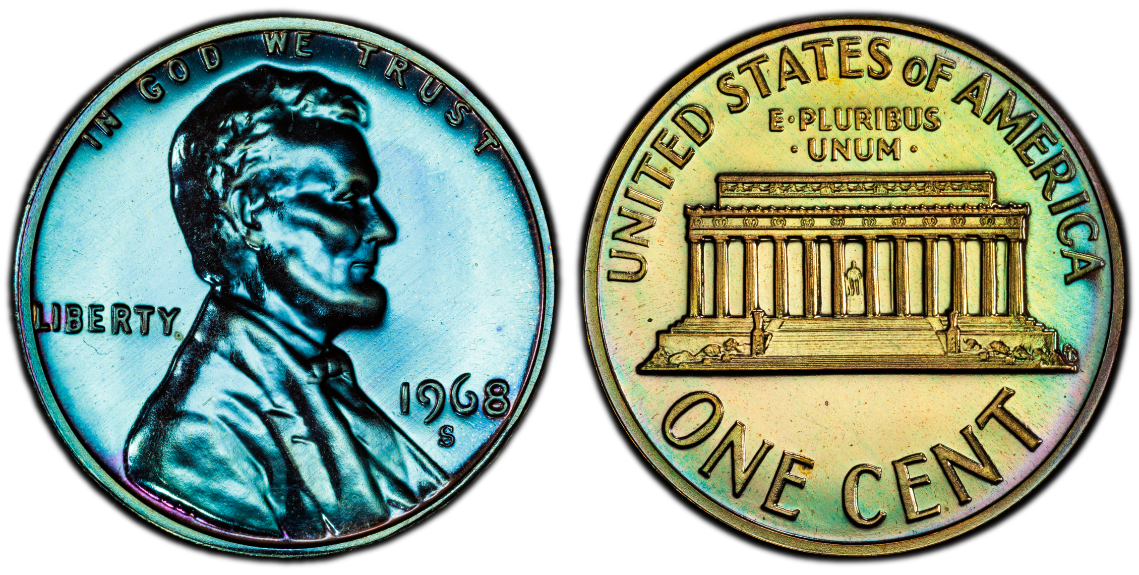 The bottom row is a different 1967 cent showing a bright yellow tone covering 99% of the coin.