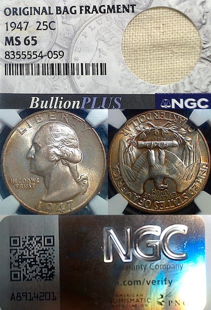 1947 US SILVER QUARTER WITH ORIGINAL BAG FRAGMENT NGC MS65 (SPOTS): $24.99