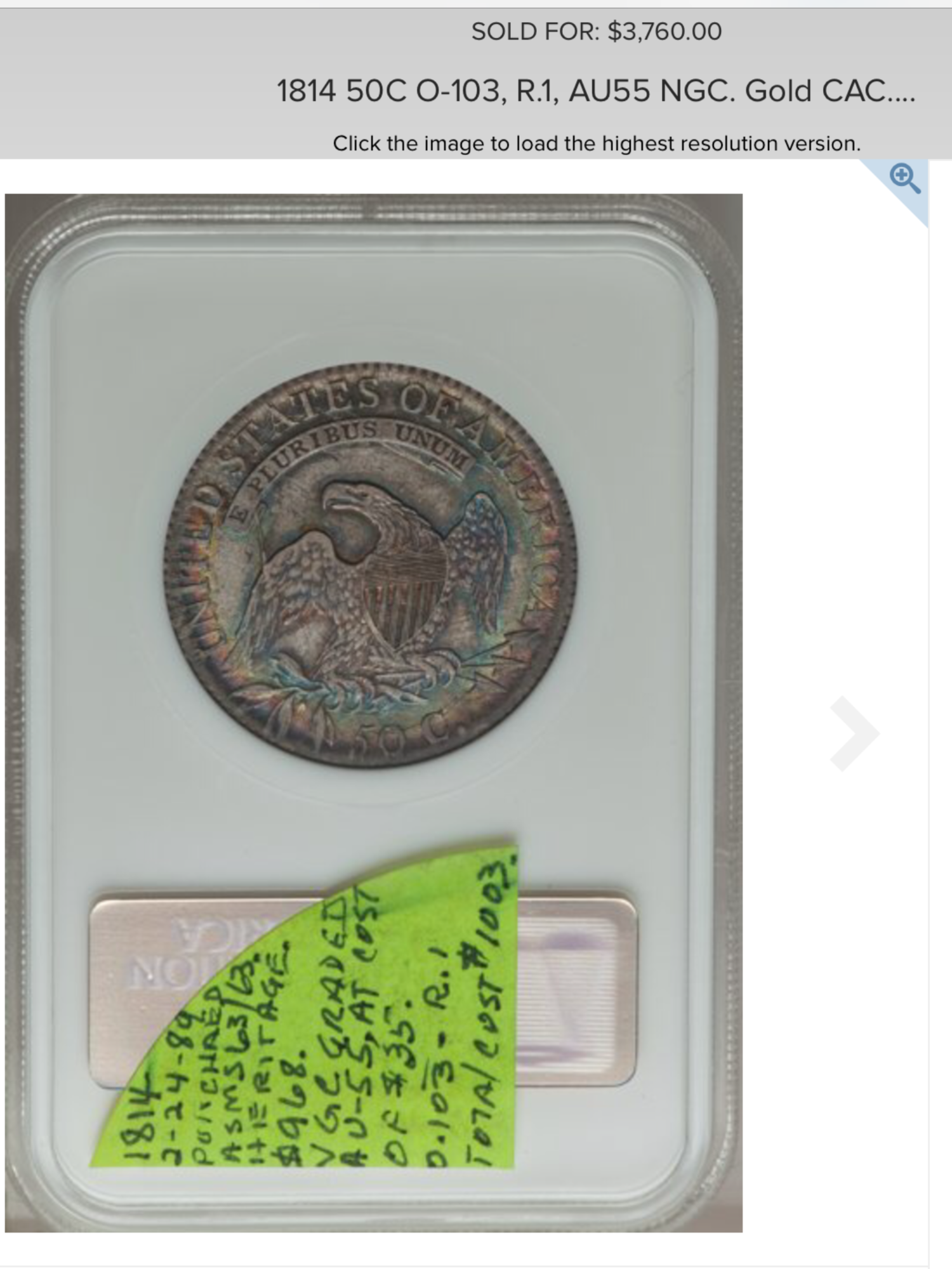 I know Lance won his amazing 1815/2 bust half NGC AU 55 CAC GOLD from the same auction and crossed it to PCGS 58.