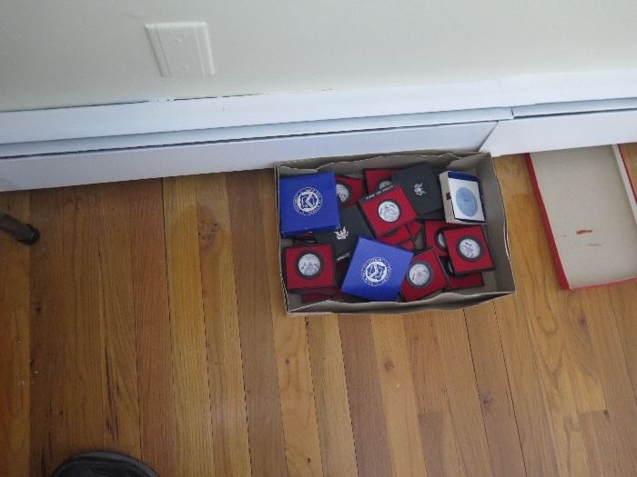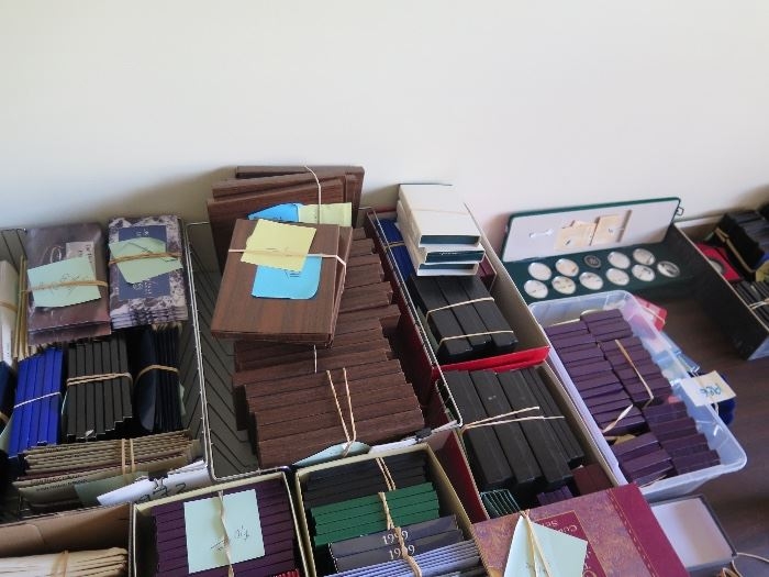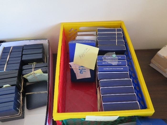I think I see 2 coin statue of liberty sets in pic 1 along with burnished unc silver eagles , pic 3 down lower left george washington halfs ?