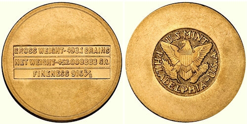 The large pieces were approximately the diameter of a US double eagle, and the small ones about the size of a US half eagle. The eagle was adapted by John Sinnock from the bullion stamp then in use at the Philadelphia Mint.